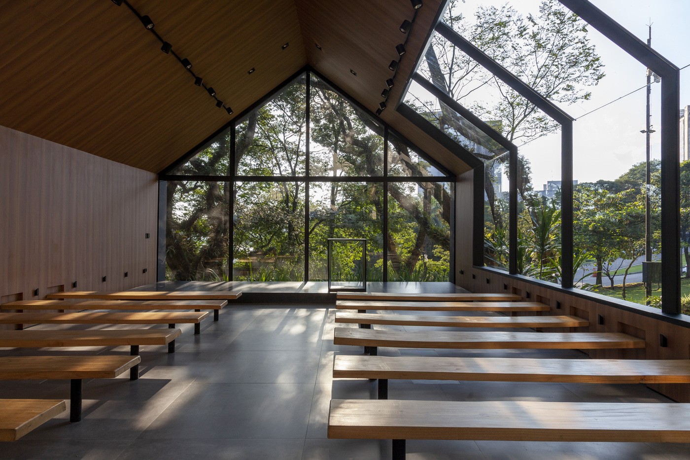 Nos jardins do Palácio dos Bandeirantes, em São Paulo, SP, o Espaço de Oração rendeu ao arquiteto Carlos Rossi um prêmio no International Interior Design Association 2026 .Como ponto de partida, ele optou por valorizar as árvores já presentes no ambiente, colocando a natureza como protagonista.