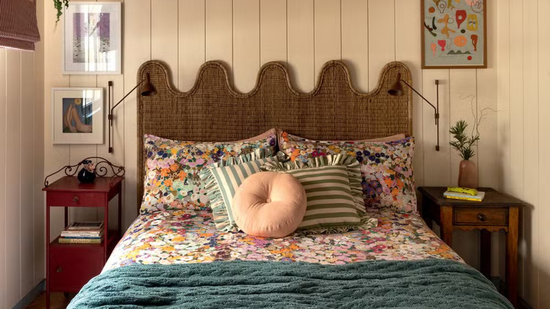 Cheio de referências ao estilo boho contemporâneo, o quarto da influenciadora digital Julie Choi é colorido e ousado. Nas paredes, a pintura de formas orgânicas mescla tons de intensidade esmaecida, conectando-se à estampa da roupa de cama. Para equilibrar a paleta vibrante, a moradora optou por uma cabeceira de fibra natural, com forma arredondada, que reforça o clima despojado do décor.