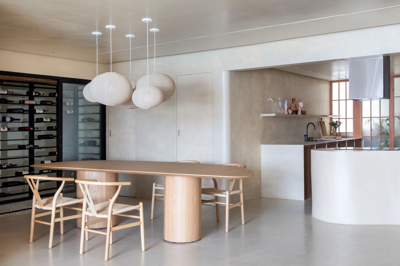 A combinação do uso dos materiais naturais e texturas rústicas, formas orgânicas, além da paleta de cores neutras e terrosas, transformam o espaço em um refúgio que valoriza a autenticidade, a beleza simples e imperfeita do cotidiano