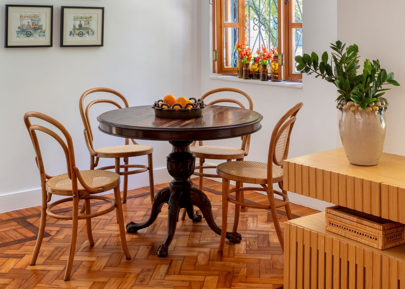 Na sala de jantar, a mesa de acervo ganhou a companhia de cadeiras Thonet garimpadas pela moradora