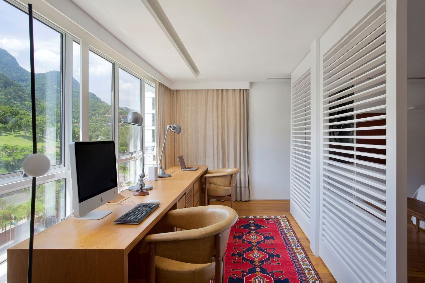 Os destaques do ambientes são a escrivaninha Ella, de Felipe Zorzeto, e o tapete kilim listrado, da Carminati. Prateleiras sob medida em lâmina natural de freijó tingido, feitas por mão de obra local. Cadeira Aeron, da Herman Miller