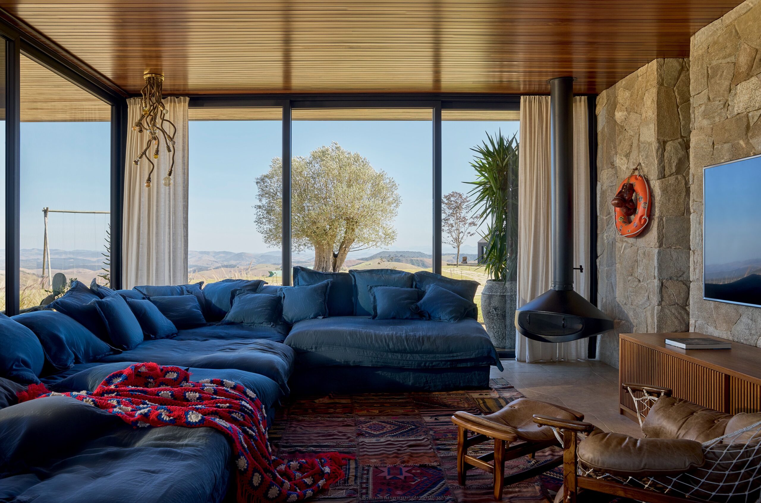 No living do Rancho da Montanha, refúgio sustentável idealizado por Bruno Gagliasso e Giovanna Ewbank a cerca de 124 km do Rio de Janeiro, a decoração acolhedora ganha toques de cor. Assinado pelo arquiteto Duda Porto, o espaço conta com amplas esquadrias que conectam o interior rústico à paisagem natural, um sofá modular em azul profundo e uma paleta repleta de tonalidades terrosas e materiais naturais.