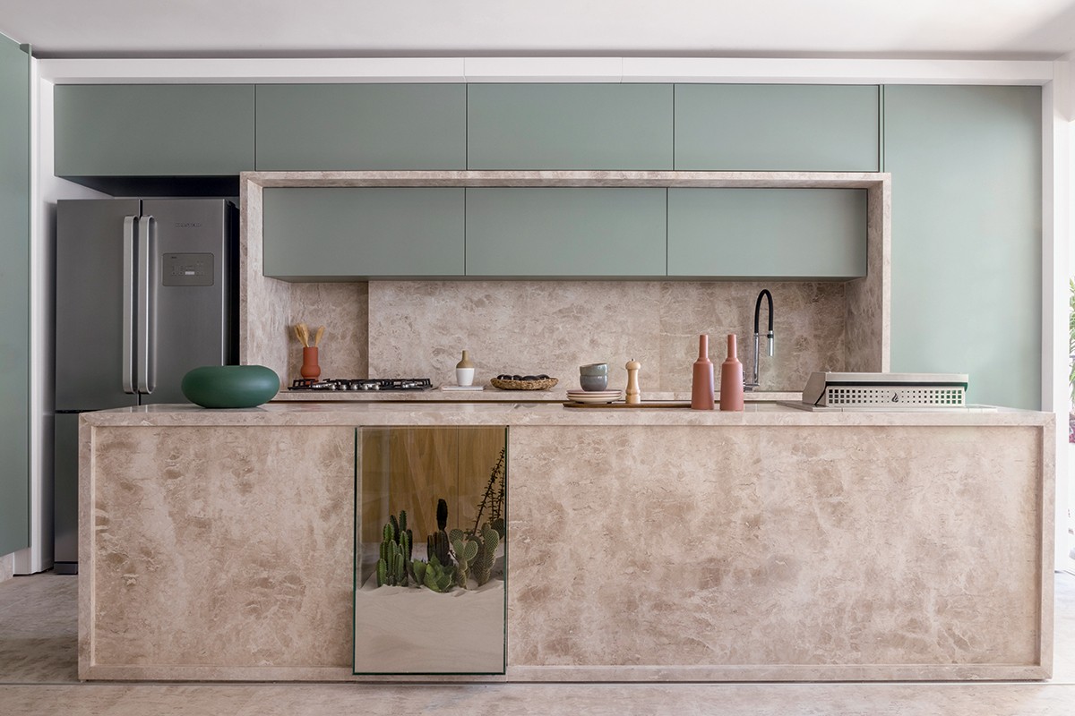 Na área gourmet, o piso e a bancada foram revestidos com mármore bege Bahia, fornecido pela RP Mármores