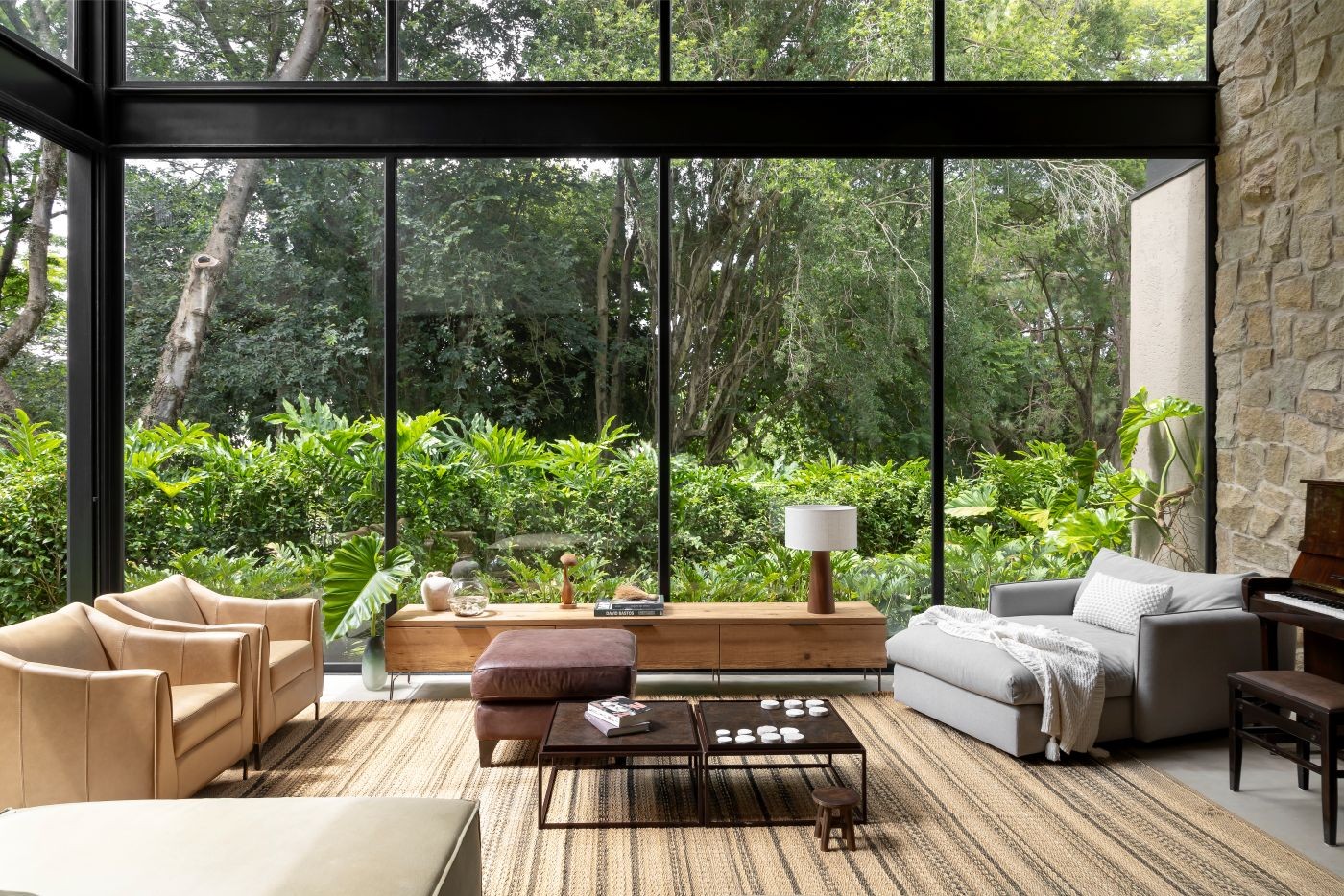 As grandes esquadrias ampliam a entrada de luz natural e estabelecem uma conexão direta dos cômodos sociais com o jardim, enquanto o forro de madeira aquece visualmente o recinto. O mobiliário reforça a proposta de convivência e descanso.