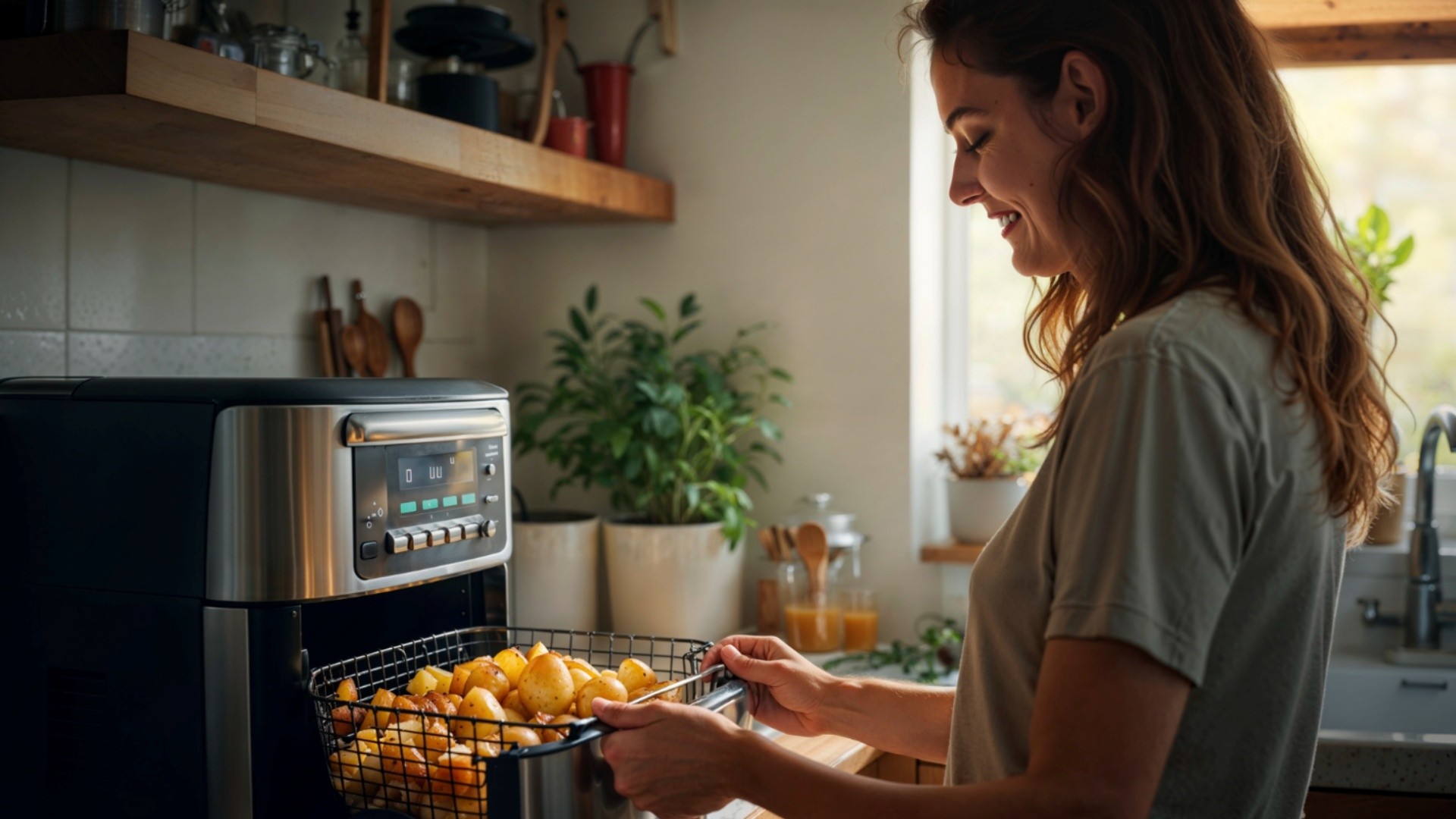 Na air fryer, é possível assar batatas sem óleo, como na imagem acima, dentre muitas outras receitas