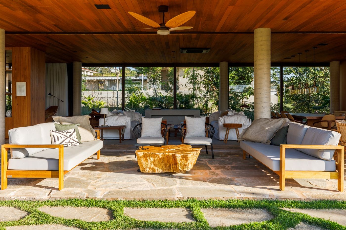 ÁREA SOCIAL | Materiais naturais servem de base neutra e rústica, como o teto de réguas de catuaba, executado por Santa Rita Madereira, e piso de cacão São Tomé. Sofás Antonia, da Firma Casa. Poltronas Braz, de Carlos Motta. Mesa de centro Picapiedra, da Casa Atica. Tapete da Oficina do Tapete. Repare que uma sela de montaria foi incorporada à decoração