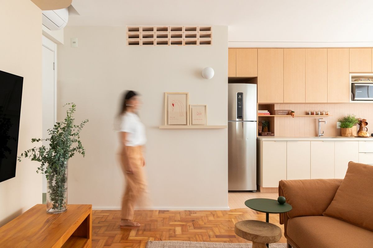 A escolha dos materiais segue a mesma lógica: marcenaria clara e funcional, revestimentos leves e soluções bem planejadas de armazenamento. O piso de taquinhos, pedido inegociável dos moradores, percorre todo o apartamento e reforça o vínculo emocional com a antiga morada.