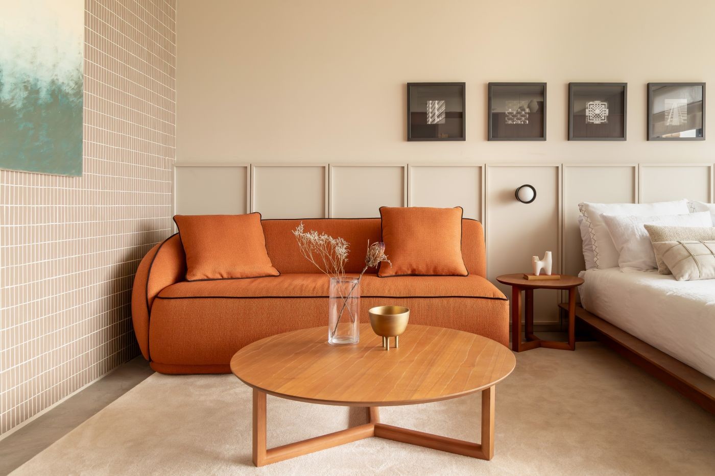 Nesta área social, a arandela redonda da Reka adiciona um ponto de cor sobre o painel branco