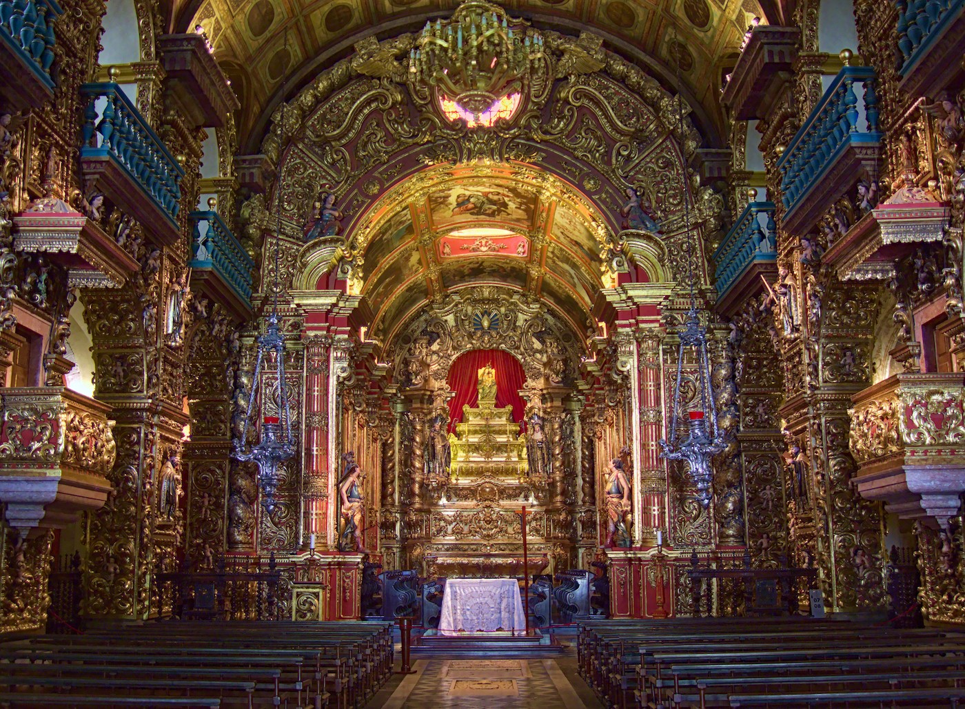 “O barroco é um estilo dramático, escuro, tenso, com formas mais pesadas. São igrejas muito ornamentadas, carregadas e que não têm quase nenhum espaço vazio. A pintura de fundo das ornamentações, que geralmente são douradas, traz cores fortes e saturadas, como vermelho, vinho e azul-escuro e, às vezes, preto”, detalha Mateus.