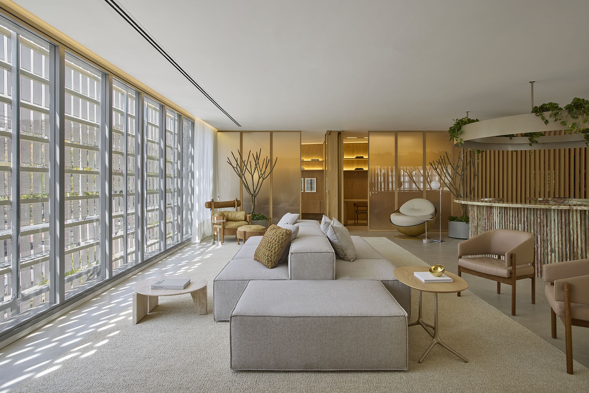 Além da vista privilegiada para as copas das árvores, a paleta de cores com tons neutros e terrosos, a iluminação quente, o uso de materiais como madeira, pedras exóticas nacionais esverdeadas, tecidos naturais como linho e juta remetem à conexão com a natureza. “Criamos espaços com muita área de circulação e alguns recantos mais reservados e aconchegantes para que o cliente se sinta em casa ou num hotel, nunca numa clínica”, explica Nildo. O nome do centro, KAI, tem sua origem na língua carajá e significa “você”, em referência ao protagonismo do cliente. A brasilidade está impressa também no mobiliário, que tem peças de importantes designers nacionais como Sergio Rodrigues, Ricardo Fasanello e Jorge Zalszupin.