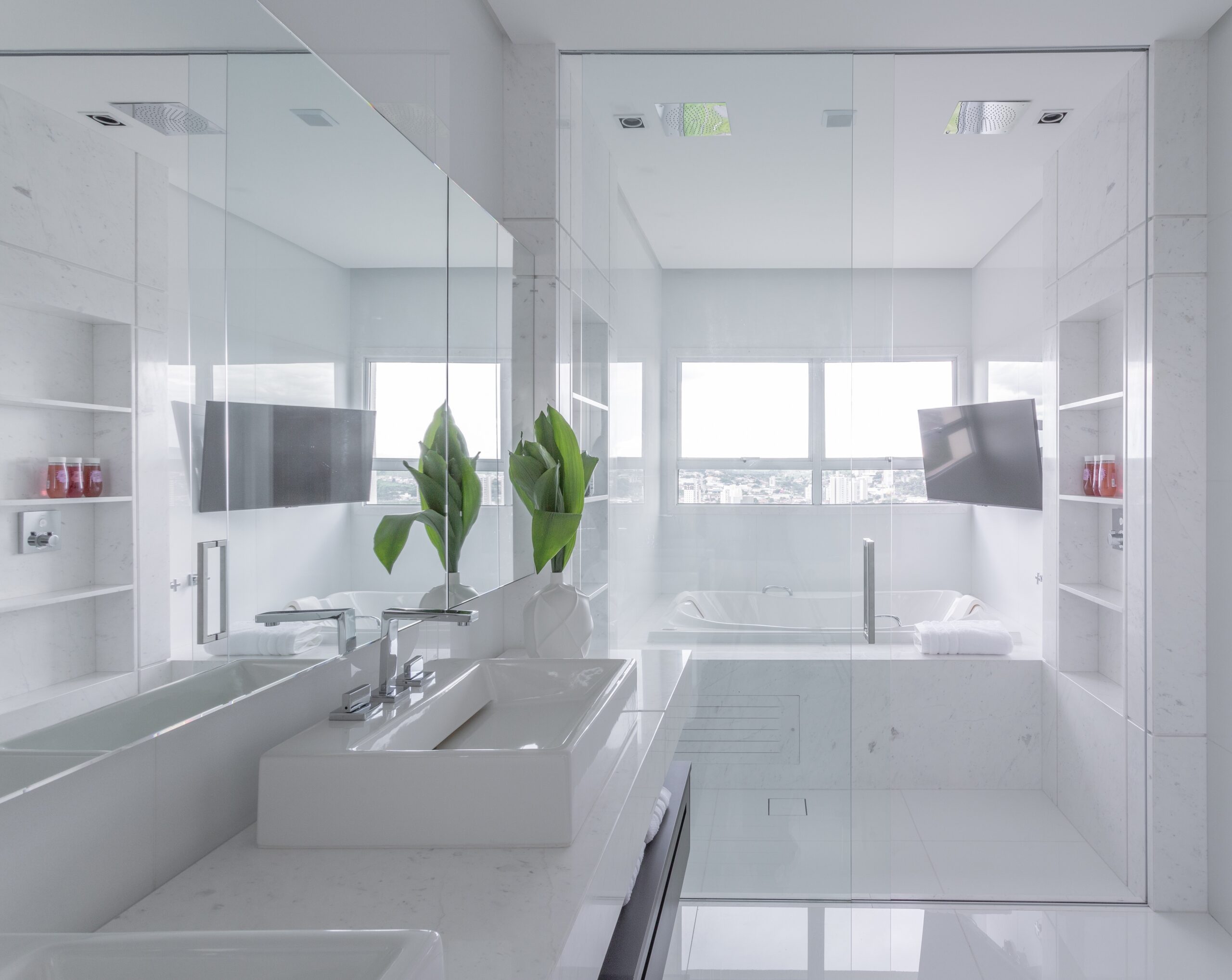 Trocar os espelhos e optar por modelos maiores ou com iluminação embutida também é uma ótima ideia — afinal, eles ampliam o ambiente e reforçam a claridade.