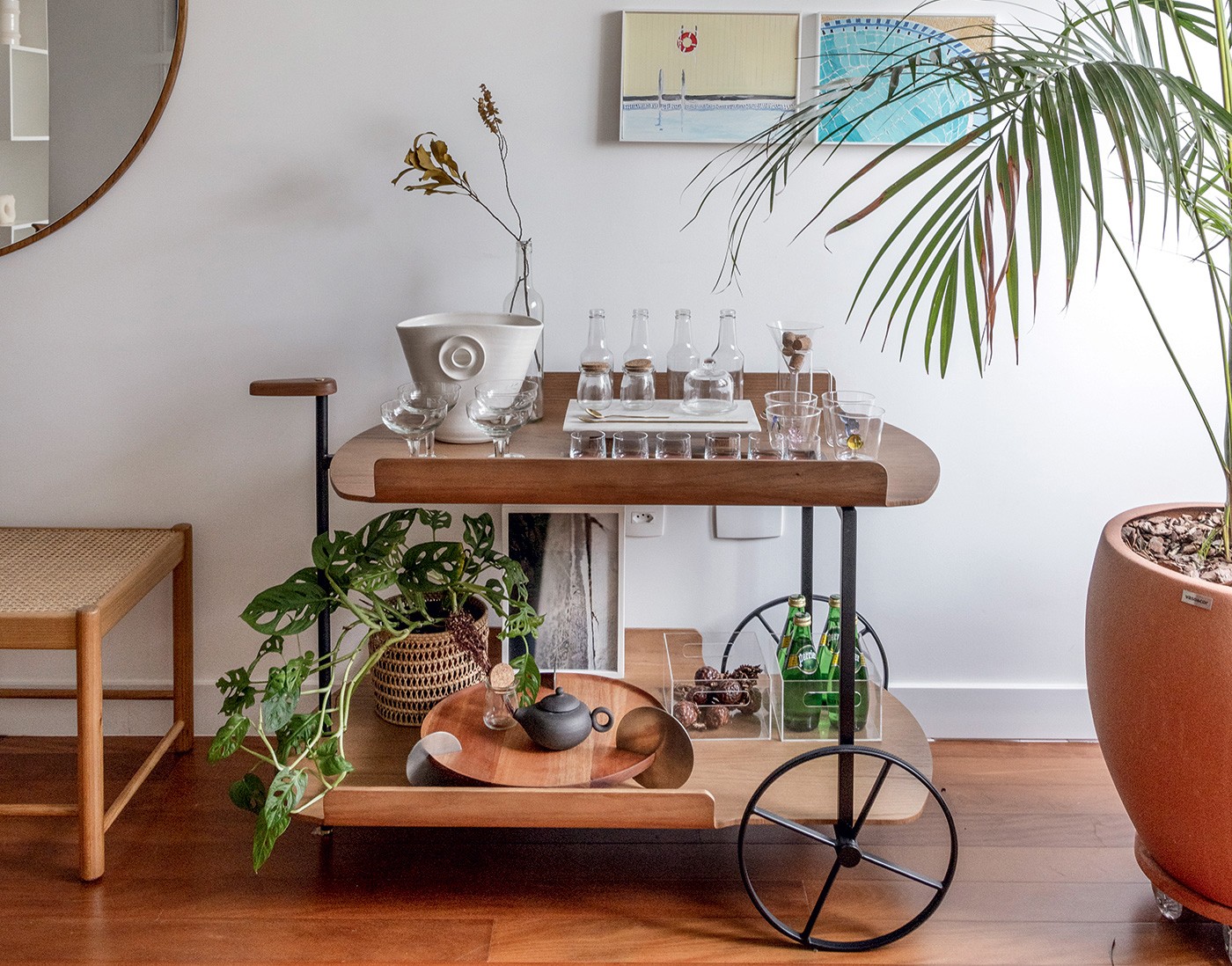 O carrinho-bar se destaca pela mobilidade e versatilidade. De modelos garimpados a peças sob medida, é uma solução prática para quem busca um lar adaptável e uma decoração sem rigidez.