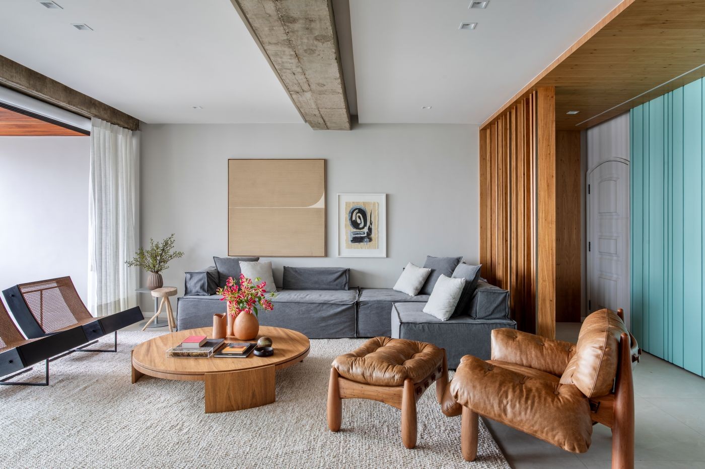Na área social, a materialidade ajuda a reforçar a atmosfera contemporânea. O piso de porcelanato e as paredes em tom cinza claro criam uma base neutra, que destaca elementos marcantes como a viga em concreto aparente e o painel deslizante em laca verde.