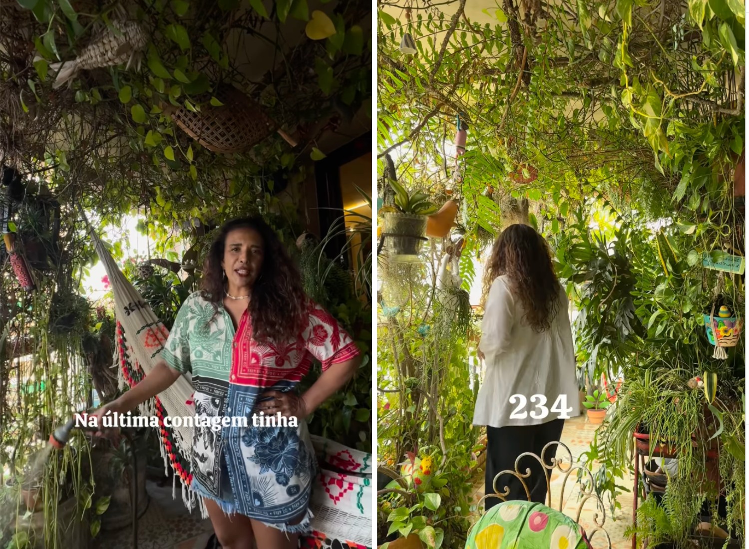 A artista conta ainda que recebe muitas mensagens de usuários preocupados com o peso dos vasos e até reclamações de vizinhos. No entanto, ela explica que possui apenas seis vasos grandes na varanda, os outros são pequenos e leves, não oferecendo risco para a estrutura. As plantas do teto, por exemplo, são jiboias que cresceram muito.