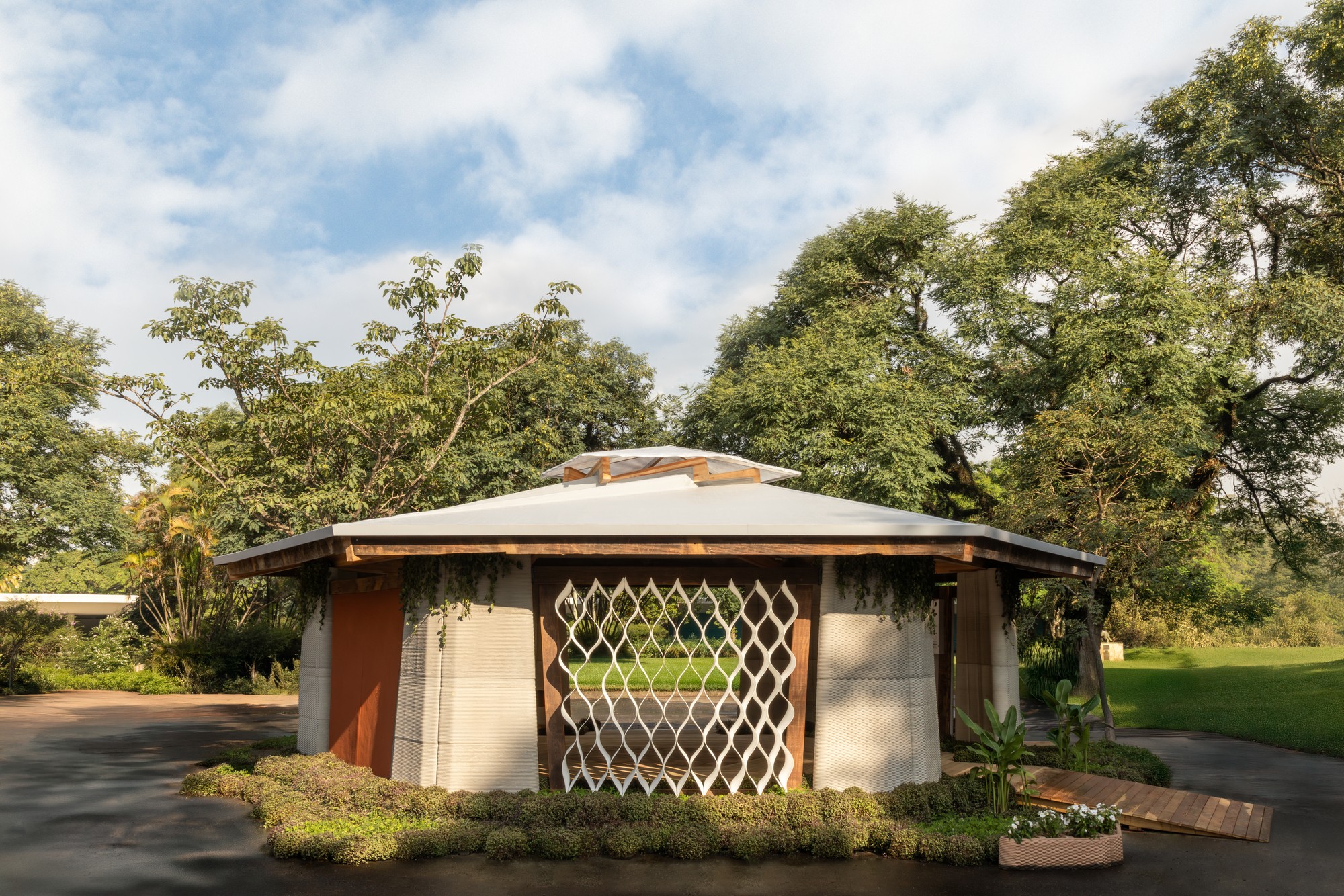 O projeto parte de uma premissa direta: construir melhor significa, antes de tudo, construir menos. Essa lógica aparece de forma evidente nos pilares estruturais, produzidos por impressão 3D em concreto. Ainda pouco difundida no país, a técnica permite um controle preciso da deposição do material, eliminando excessos e dispensando o uso de fôrmas. Inspirados na estrutura interna do caule da bananeira, esses elementos adotam uma configuração alveolar que equilibra resistência e leveza. Na prática, isso se traduz em uma redução significativa no volume de concreto utilizado, com impacto direto nas emissões de carbono associadas à obra.