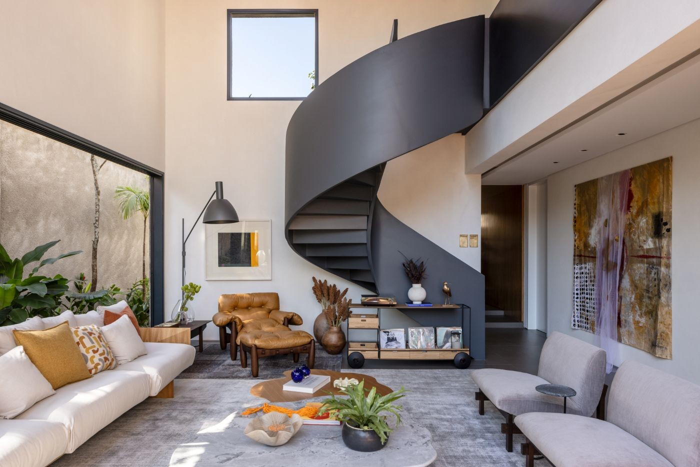 A volumetria contemporânea é marcada pela escada helicoidal metálica, que se torna elemento escultórico na sala de estar com pé-direito duplo, em contraste com o uso generoso da madeira, presente no teto, na marcenaria planejada e no piso da área íntima.