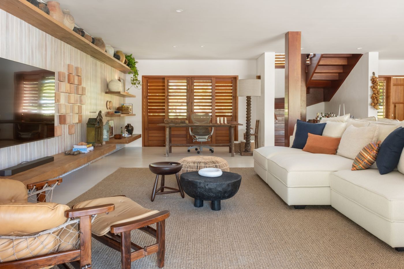 A residência é caracterizada por um living integrado com a sala de estar, cuja proposta de acolhimento se revela. O espaço foi pensado para favorecer a ventilação cruzada e a entrada abundante de luz natural, enquanto a marcenaria em madeira peroba-rosa ajuda a criar continuidade entre os cômodos.