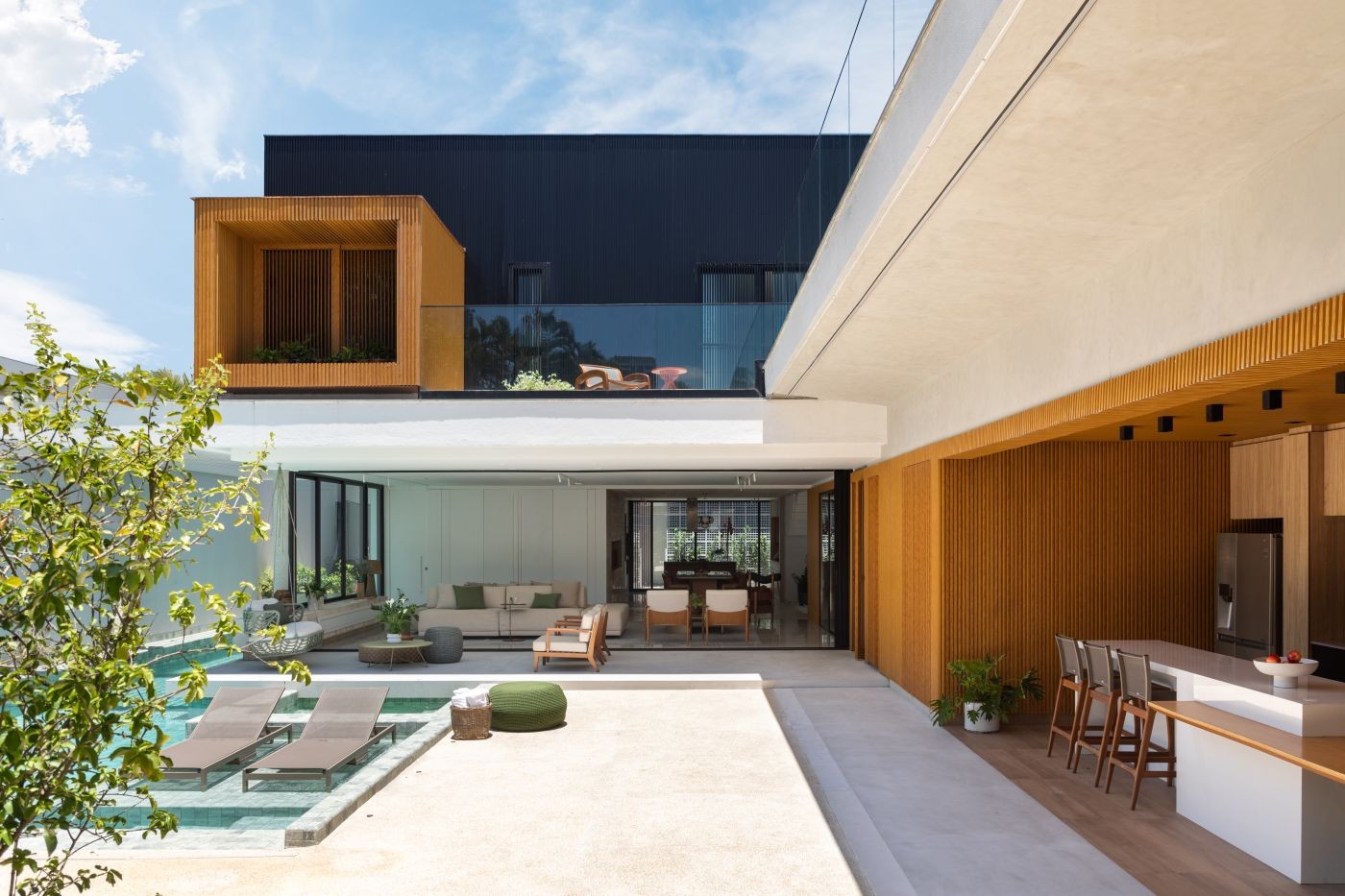 A fachada já antecipa o caráter contemporâneo da residência. Grandes planos em tom grafite definem o volume frontal onde estão a garagem e o foyer de acesso, enquanto painéis de alumínio que imitam madeira criam contraste e aquecem a composição. Esses elementos amadeirados, aliás, não se limitam ao exterior: eles conduzem o olhar e o percurso desde o portão ao interior da casa, o que valoriza a sensação de continuidade. Amplas esquadrias de vidro reforçam a permeabilidade visual e permitem que os ambientes se integrem completamente quando abertas.