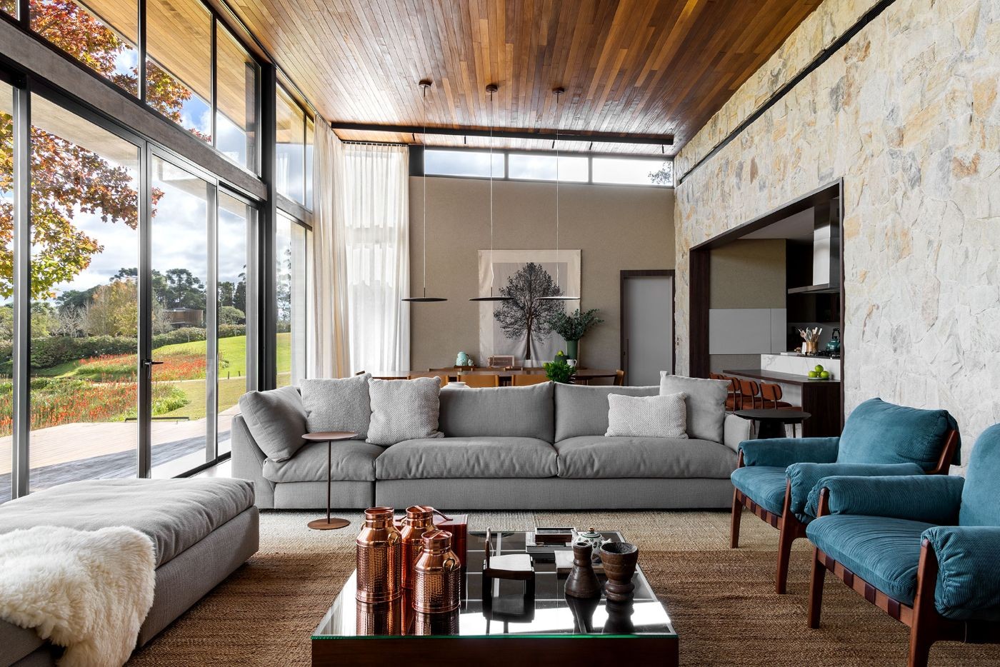 “Nosso desafio foi criar espaços internos que intensificassem a presença da paisagem, permitindo que o externo entrasse través dos grandes panos de vidro, que funcionam como quadros vivos”, afirma a arquiteta Juliana Pippi (@julianapippi), responsável pelo projeto.