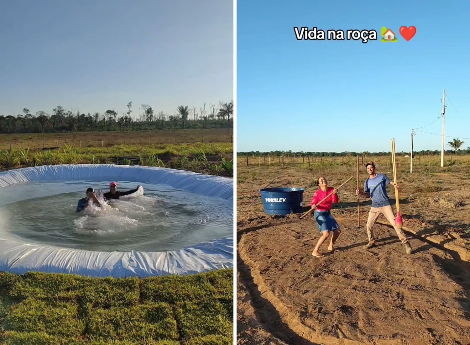 O casal Erikson Fonseca e Weryca Reis, de Juína (MT), viralizaram ao mostrar no TikTok e no Instagram como construíram uma piscina gigante de lona com as próprias mãos. Em uma série de vídeos, eles registraram cada etapa da criação da área de lazer no sítio, da escavação até o acabamento da borda e a colocação da grama ao redor.