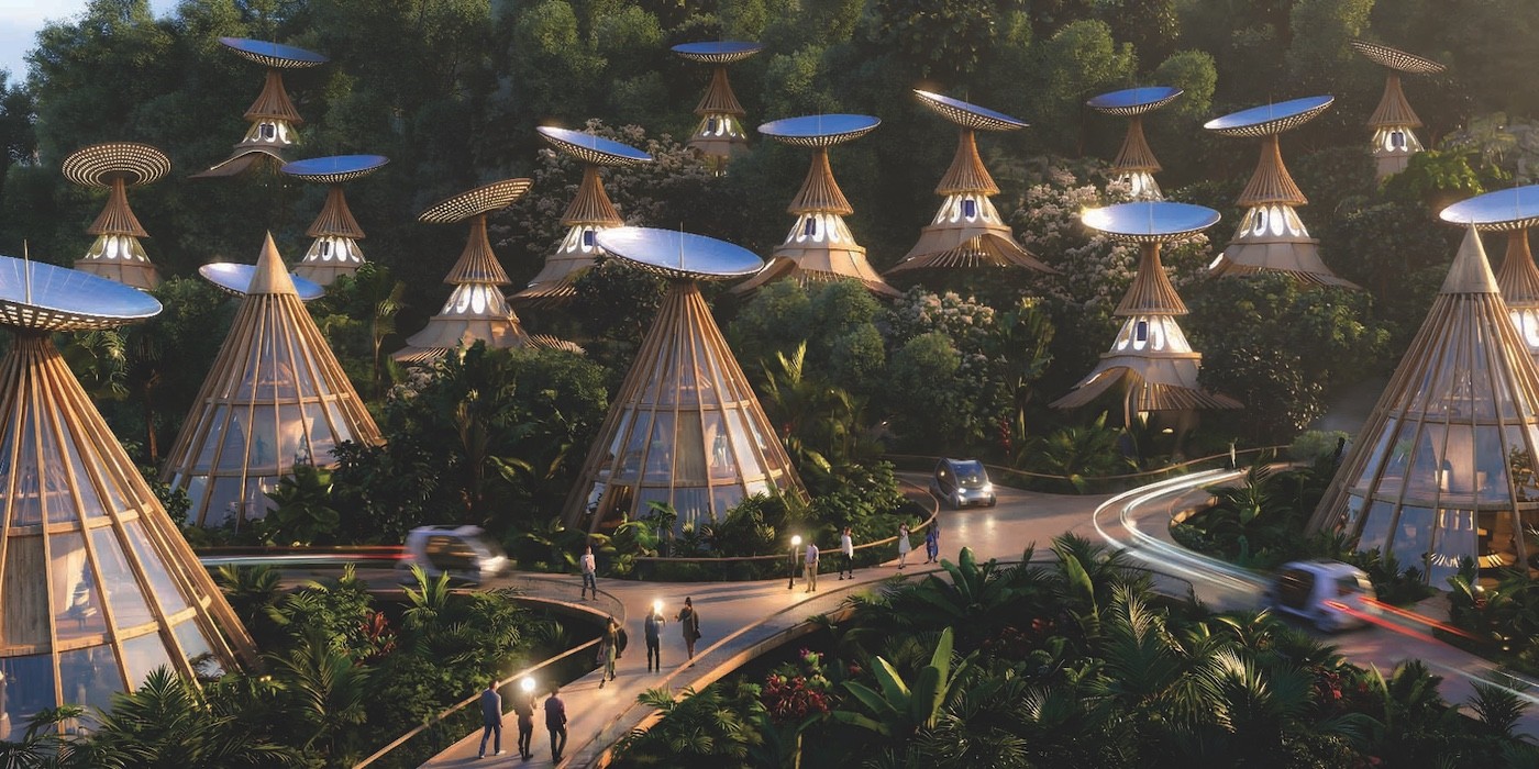 Caminhos públicos em níveis atravessam o terreno e conectam as unidades habitacionais do projeto em Fiji, criando um ecossistema arquitetônico que produz energia solar sem alterar a topografia da floresta