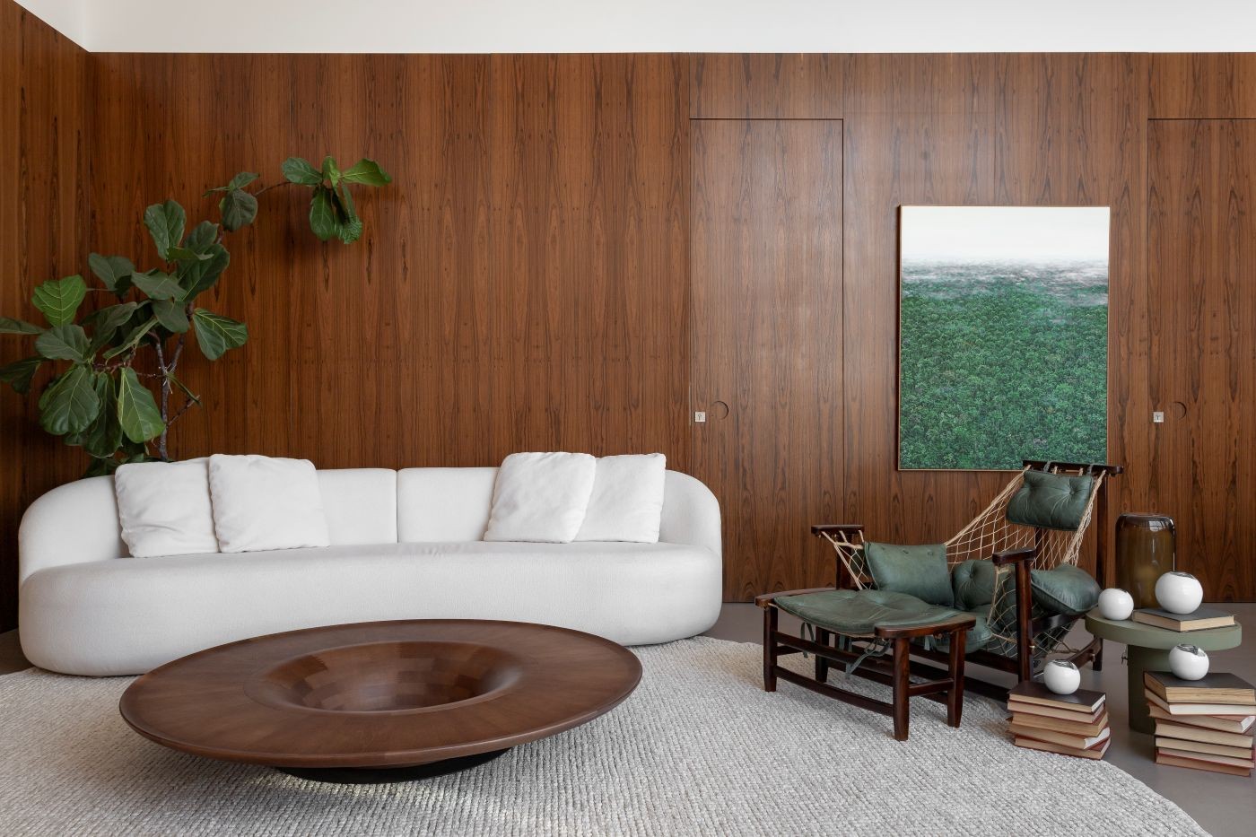 Entre os destaques estão a poltrona Jangada, de Jean Gillon, e uma mesa de centro escultural assinada por Jader Almeida. Obras de arte e esculturas cerâmicas em tons terrosos completam a composição.