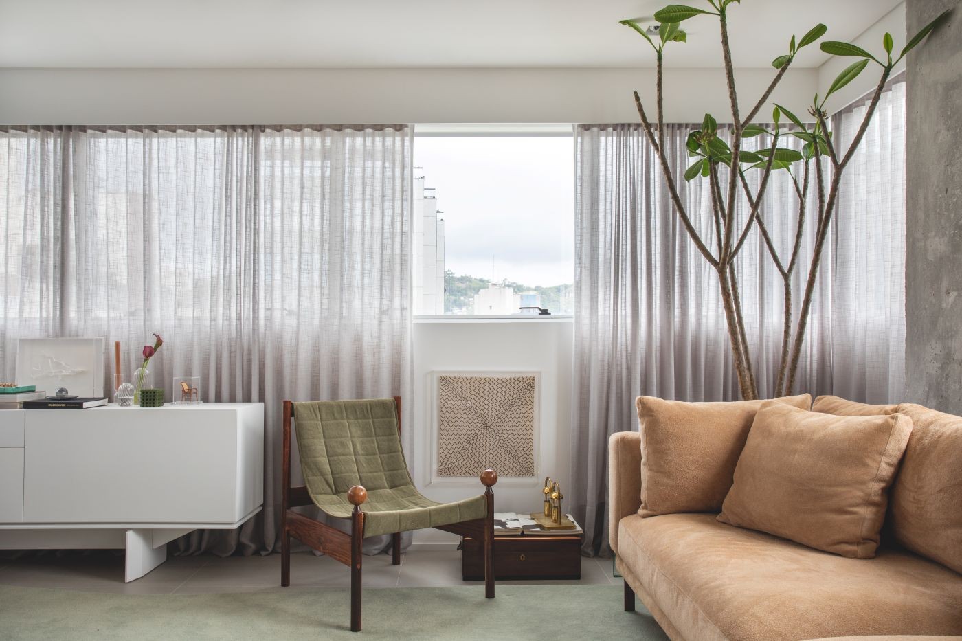“Transformei algo que era um desafio em uma virtude. Sob as janelas, criei uma galeria de arte que aparece nos intervalos das cortinas, com ritmo e organicidade”, ele conta.