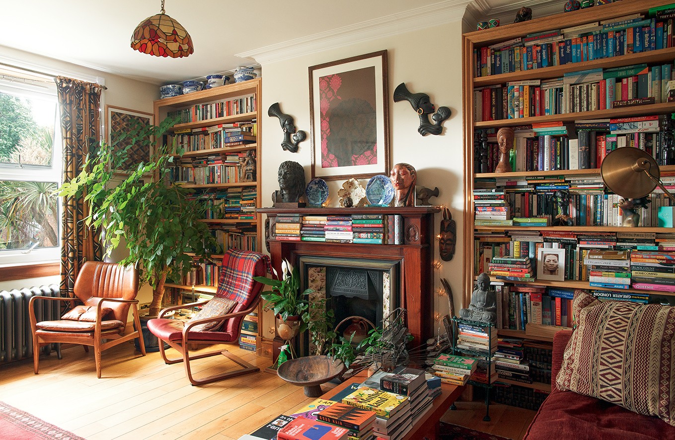 Já no interior da residência, a moradora criou cenários que ostentam suas paixões. A sala de estar dá o tom dos demais ambientes, com livros por todo lado: clássicos de Kafka, Joyce, Du Bois e Baldwin se misturam às obsessões do momento, autores negros do Caribe, da África e das Américas, como Marlon James, Mateo Askaripour, Kei Miller, Chimamanda Ngozi Adichie, Celeste Mohammed, Ayanna Lloyd Banwo e Monique Roffey, entre tantos. Quando as estantes e prateleiras não são suficientes, os títulos se acomodam sobre a lareira, dividindo espaço com esculturas de mulheres africanas.