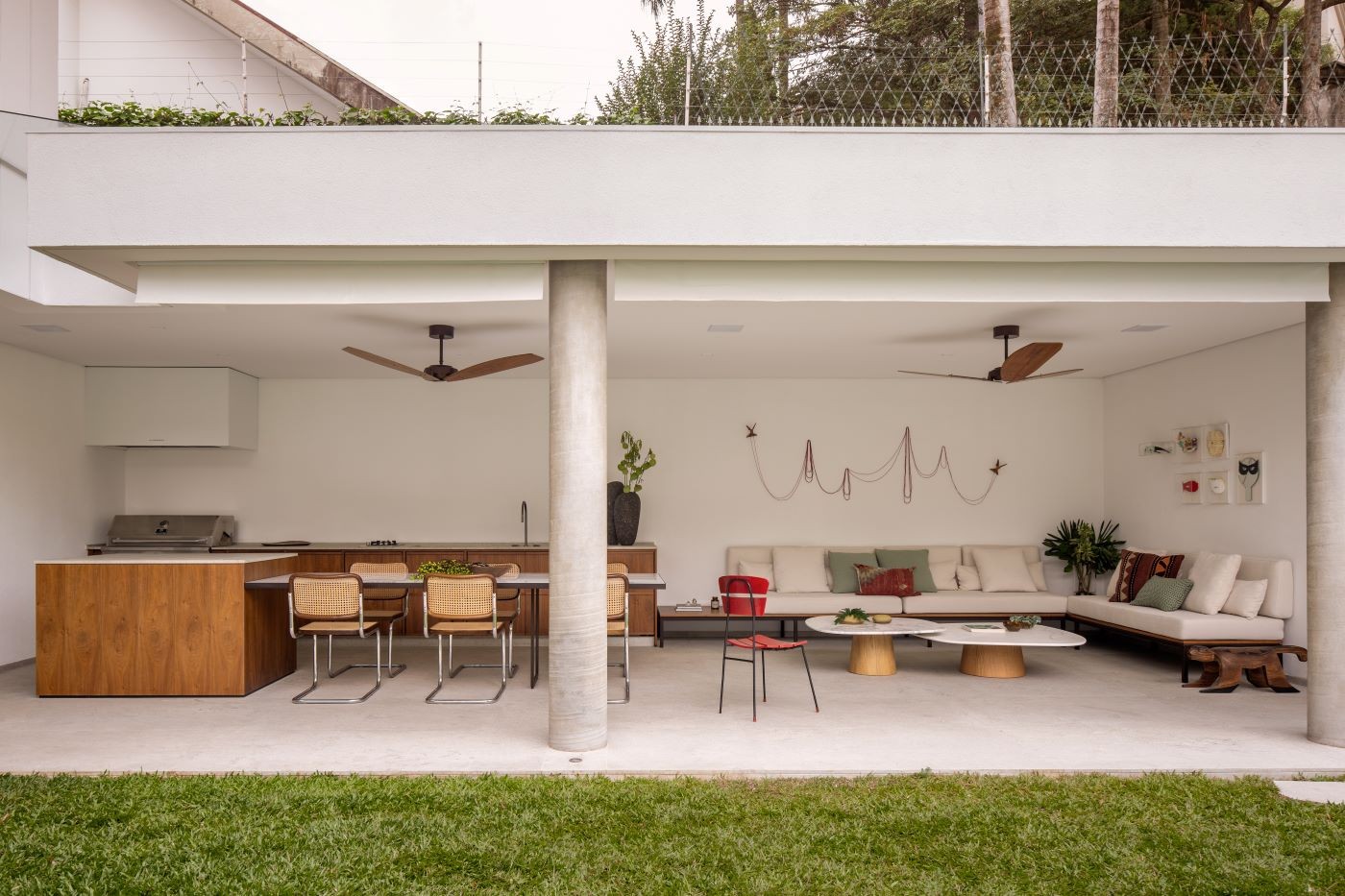 Essa varanda gourmet conta com o ventilador da Ventdecor, um exemplo de como peças podem ser escolhidas para dialogar com o modernismo tropical