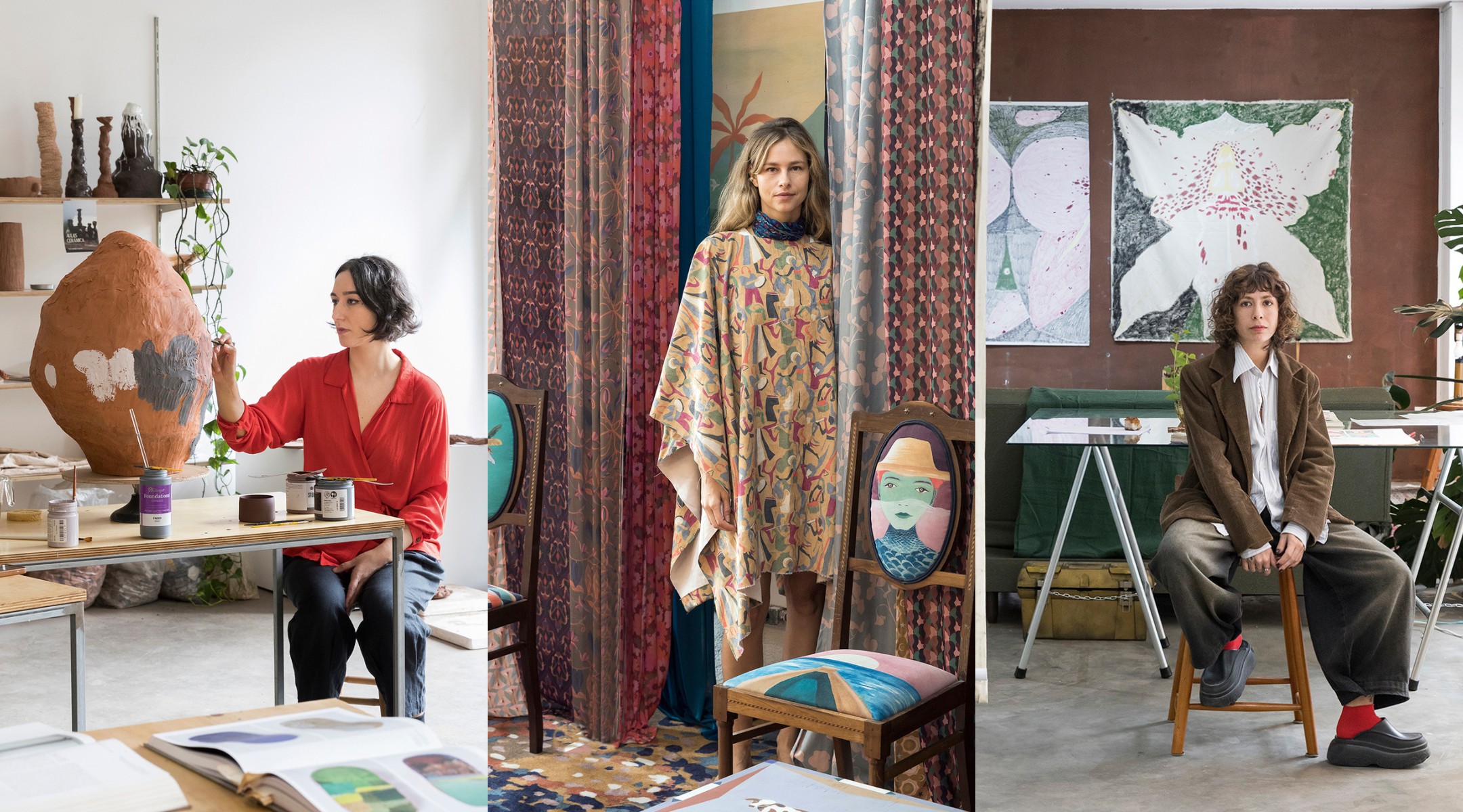 Jade Marangolo posa entre tecidos com estampas autorais e cadeiras da coleção Epifania, sobre o tapete Mergulho