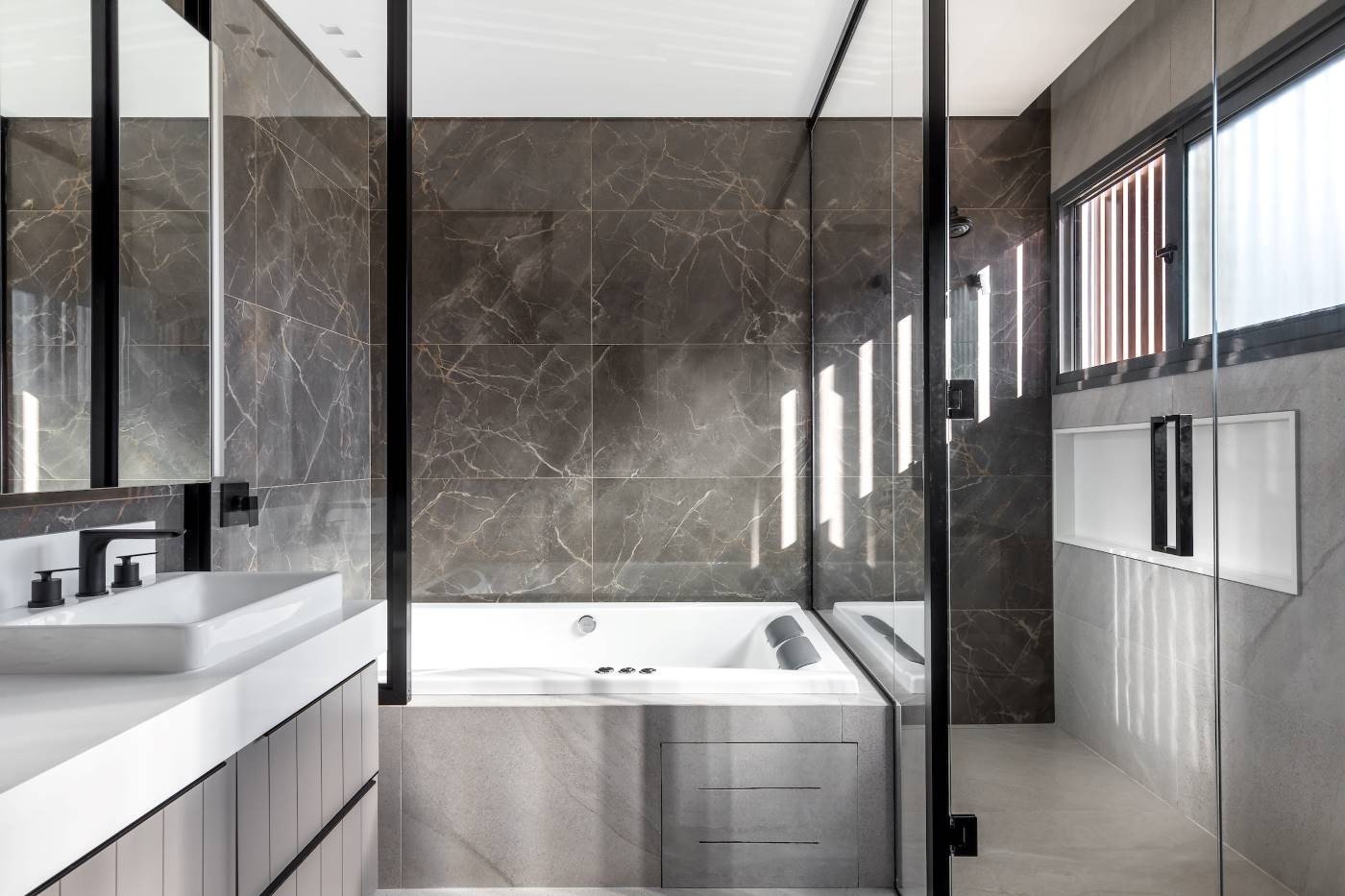 O porcelanato marmorizado pode ser uma aposta inteligente para os banheiros, sejam pequenos, sejam grandes. Com aparência semelhante ao mármore natural, o material combina beleza, resistência e fácil manutenção, além de ser mais acessível. “Ele reproduz a estética do mármore com veios, cores e texturas similares as da pedra”, diz a arquiteta Ana Lívia Werdine, do escritório AW Arquitetura.