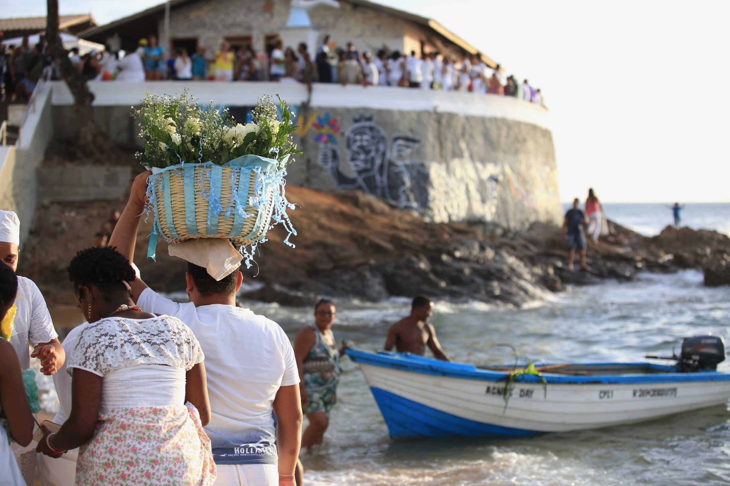 Em fevereiro, ao lado da Casa de Iemanjá é construído um caramanchão para abrigar todos os presentes recebidos durante o dia. “É uma estrutura de madeira com folhas de palmeira para receber os milhares de devotos que levam flores, perfumes, sabonetes e outros presentes”, conta Vagner Rocha, diretor de patrimônio da Fundação Gregório de Mattos (FGM). No final da tarde, por volta das 16 horas, os pescadores organizam um barco que leva as oferendas em um cortejo pelo mar.