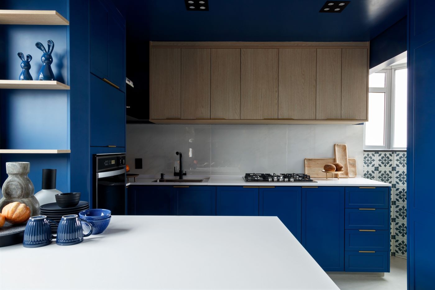 O azul pode ser usado de diferentes formas no projeto da cozinha. Neste caso, o pórtico azul permitiu criar armários superiores na cozinha.
