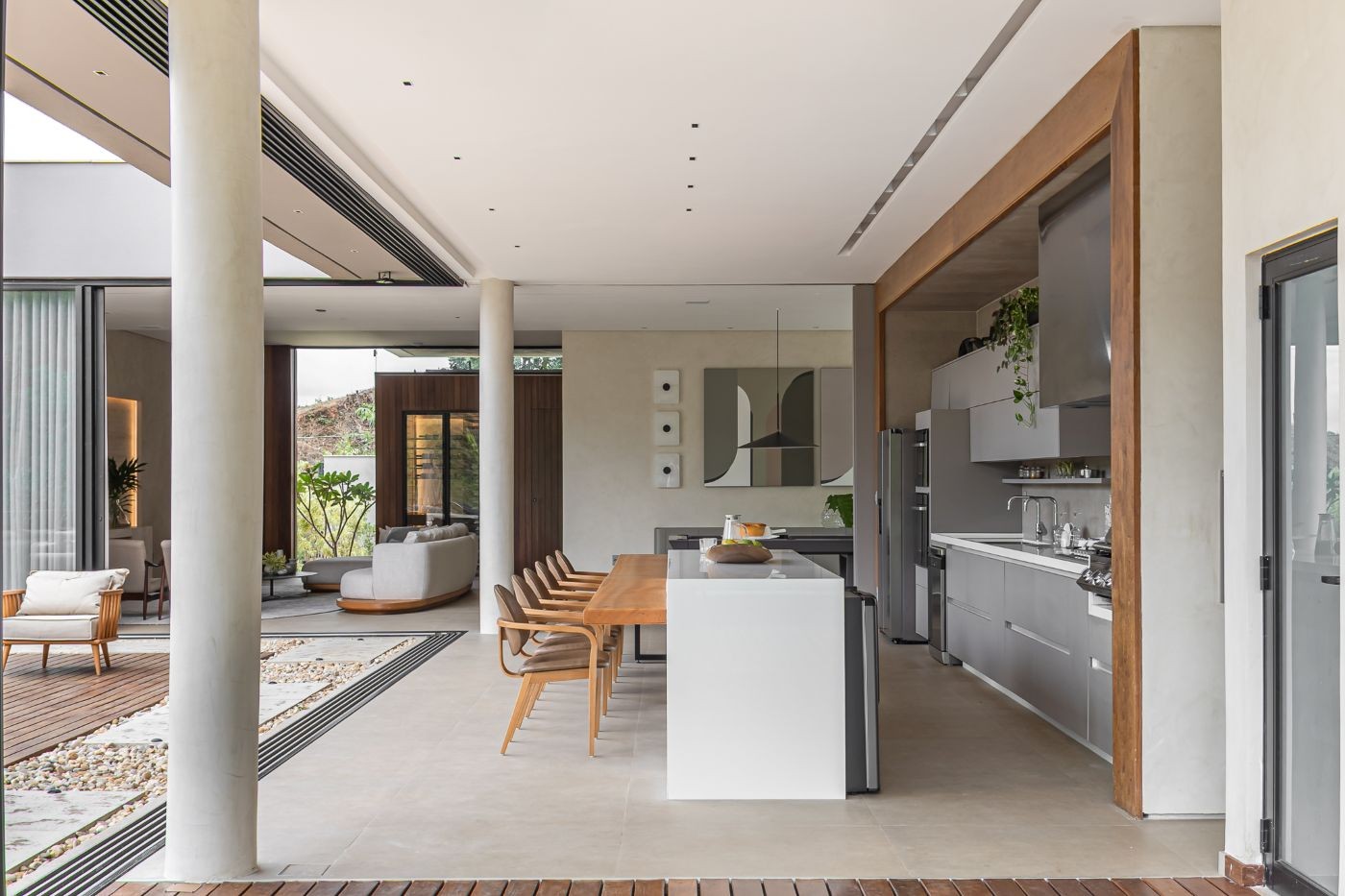 Dentro desse espírito, a cozinha ganhou protagonismo e foi desenhada para funcionar também como um amplo gourmet, de onde se vê praticamente toda a área externa e se conecta ainda com os interiores. “Era fundamental que os ambientes sociais conversassem entre si e com a paisagem. Criamos um grande espaço fluido, onde cozinhar, conviver e relaxar acontecem ao mesmo tempo”, explica Sílvia.