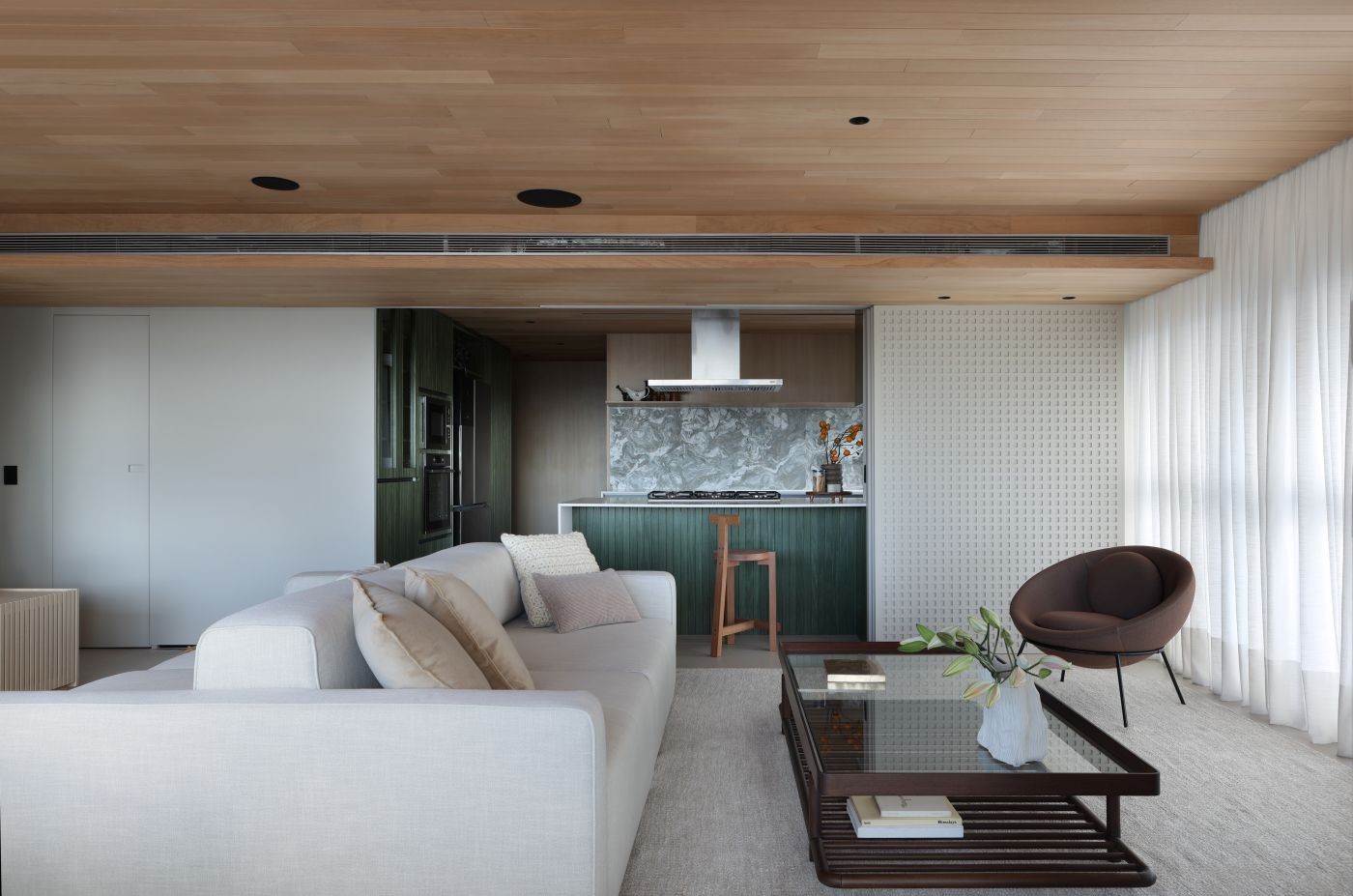 O forro de madeira especial ajuda na acústica e ainda embute o ar-condicionado, cuja distribuição aproveita a estrutura da varanda para resfriar diferentes pontos da área social. “Eles desejavam um áudio impecável, então tratamos o forro como um elemento estético e técnico ao mesmo tempo”, diz a profissional.