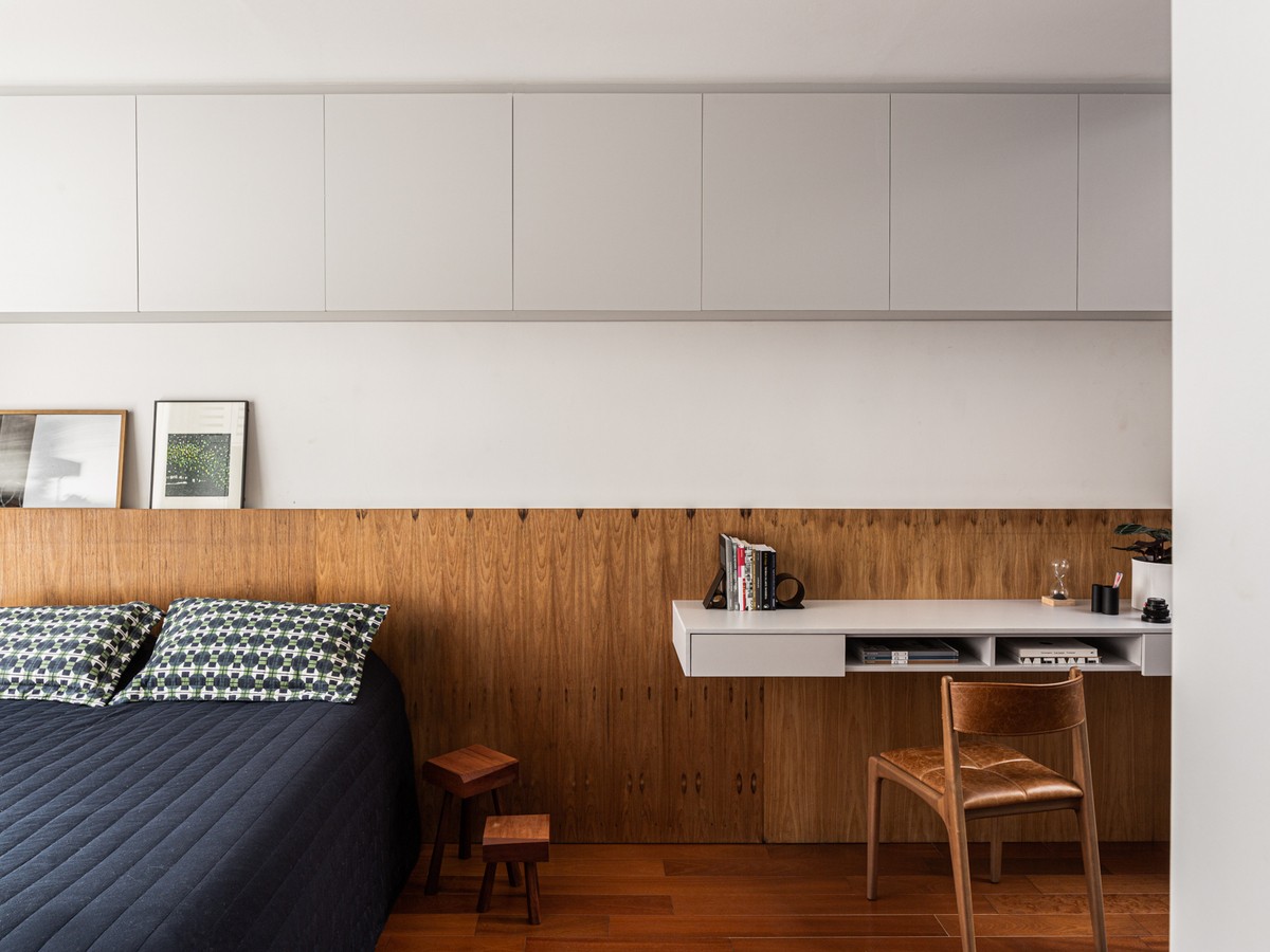 A bancada de trabalho pode funcionar como uma extensão dos elementos já presentes no quarto. Neste caso, integra-se à cabeceira de madeira da cama, criando continuidade visual