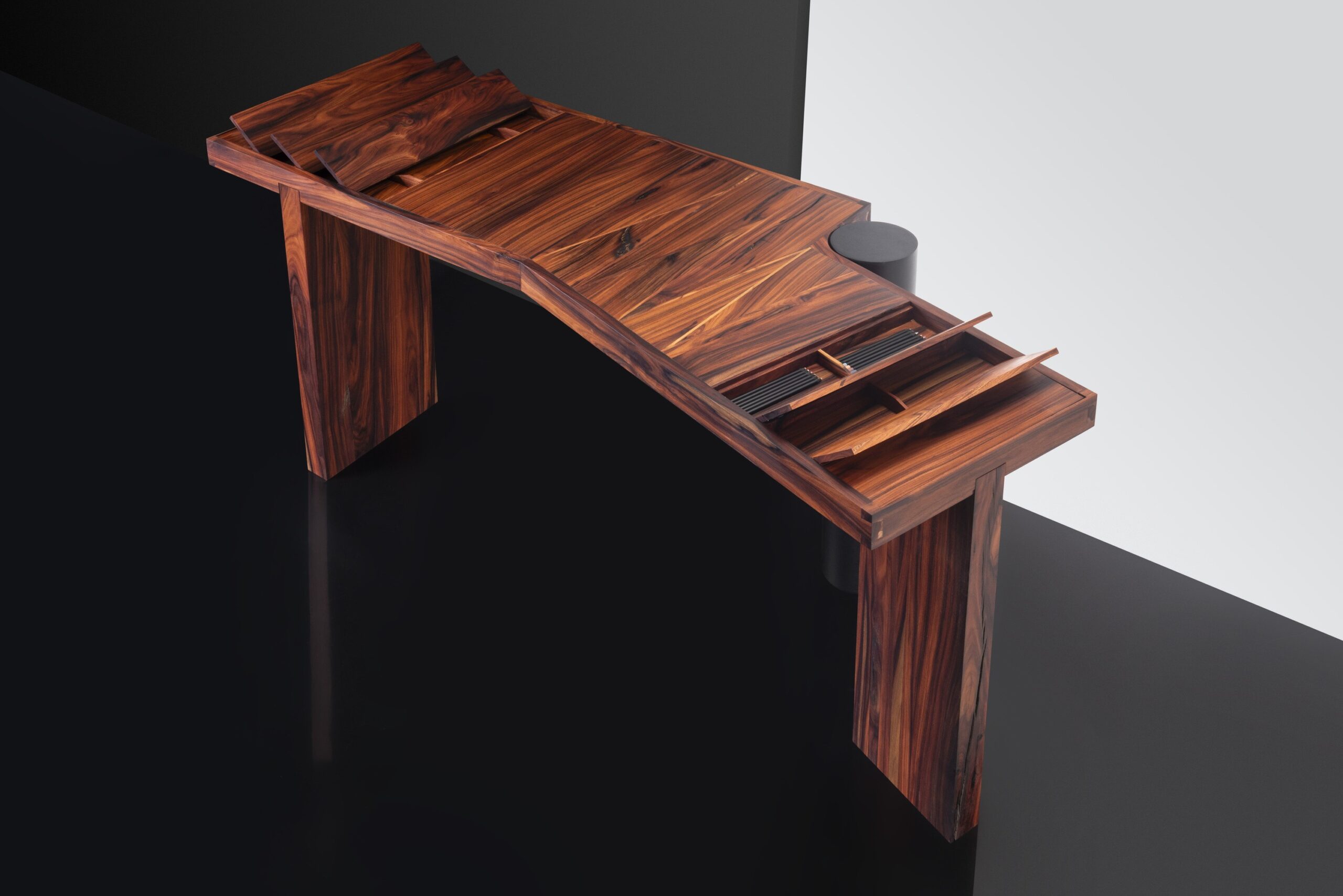 No caso da escrivaninha, especificamente, remete aos mestres que modernizaram o mobiliário brasileiro, assumindo a continuidade dessa história. O desenho irregular do tampo posiciona o móvel no centro do espaço, exigindo um olhar em 360° e transformando sua construção em elemento de contemplação.