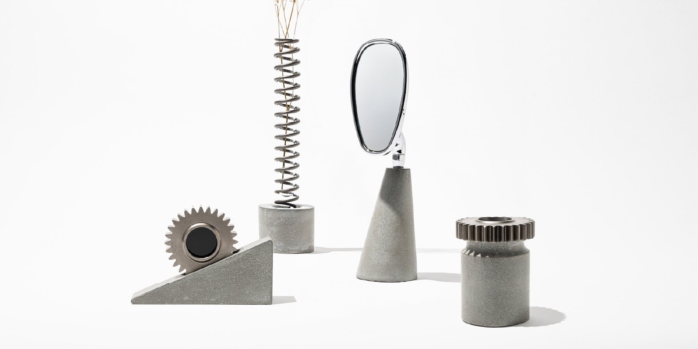 Na série “Pause”, peças de motocicletas ganharam uma nova função, explorando o contraste entre concreto e a engenharia de precisão como proposta de design sustentável