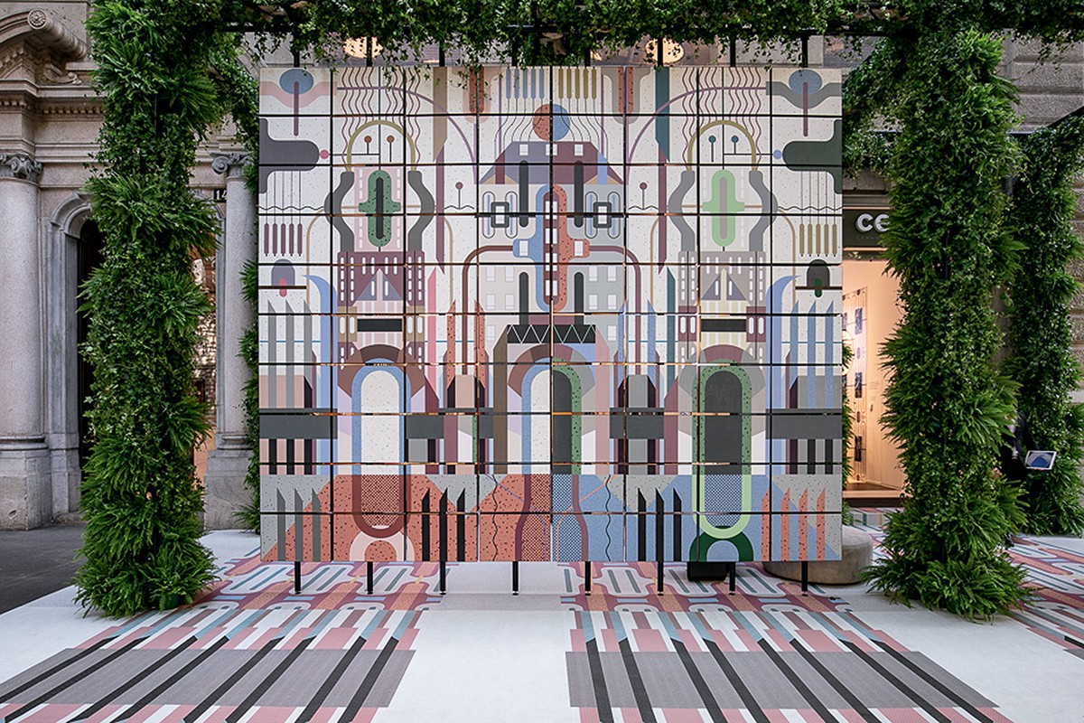 Painel montado como um quebra-cabeça pela designer Elena Salmistraro, em parceria com a marca de cerâmica CEDIT, durante a Semana de Design de Milão em 2021