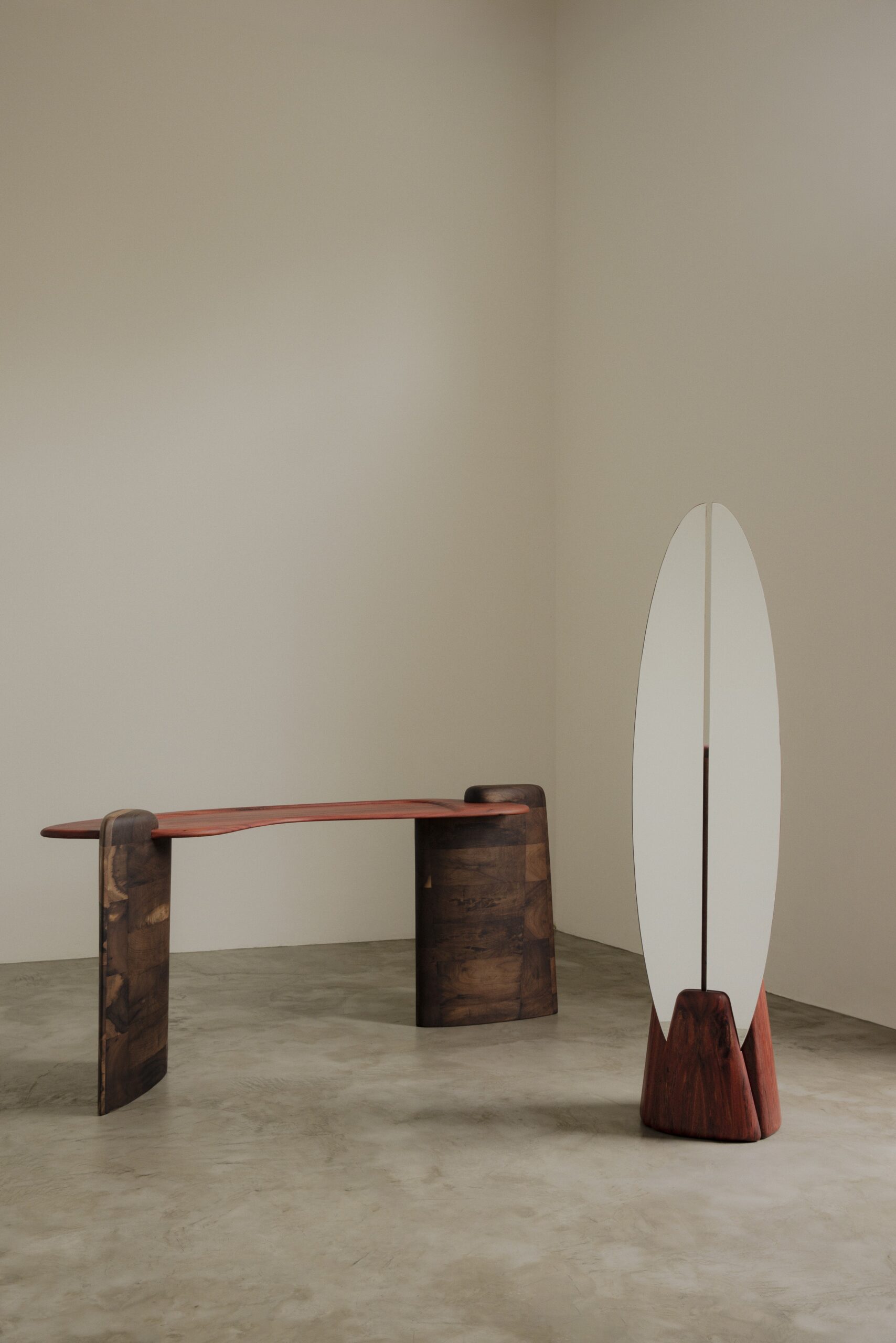 Formado em arquitetura, o criativo desenvolve peças que surgem da interseção entre arte, técnica, trabalho manual e conhecimento teórico. Todo o trabalho é feito à mão, por ele mesmo, em um processo que valoriza tanto a precisão quanto a expressão criativa. Para o novíssimo espelho, utilizou madeira imbuia proveniente de um galpão desmontado no Sul do país. Essa mistura entre design e arte atravessa profundamente sua produção, sempre guiada pelo desejo de criar peças que não apenas ocupem a casa, mas que se tornem verdadeiros personagens dentro dela.