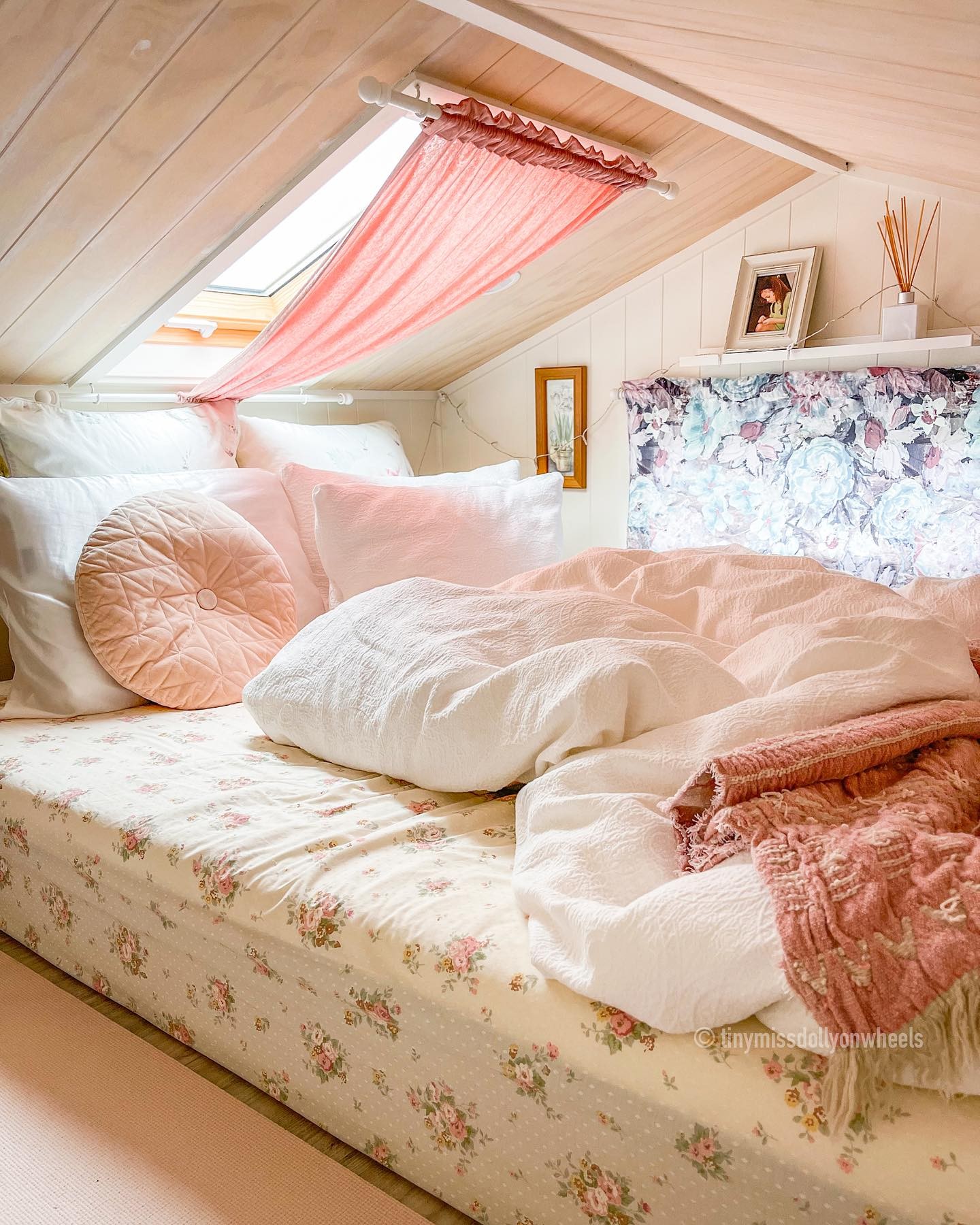 O interior do lar de Dolly é um charme, com decoração em tons de branco e rosa, além de objetos e móveis vintage e artesanais.