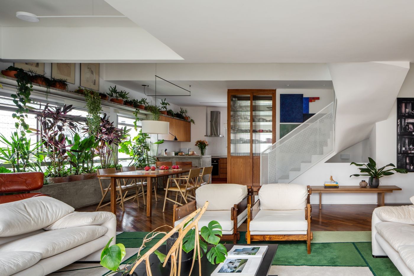 A cobertura no Jardim Paulista passou por uma reforma que respeita a arquitetura original e aposta em soluções como jardineiras integradas à estante e guarda-corpo metálico perfurado na escada Este apartamento no Jardim Paulista, em São Paulo, marca a terceira vez que os arquitetos Ana Sawaia (@anasawaia) e Paulo Alves (@pauloalvesdesign) reformam a morada de uma mesma família, agora para transformar uma cobertura tríplex com jeito de casa.