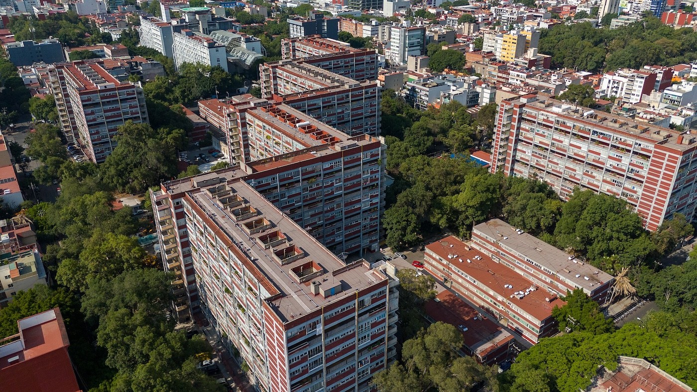 Vista aérea do Centro Urbano Presidente Alemán (CUPA) em meio à malha densa da Cidade do México
