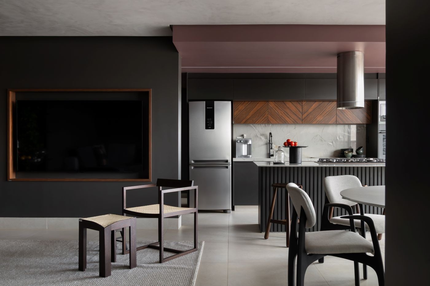 A paleta de cores desempenha papel central nessa construção. Tons neutros e escuros — como grafite, preto e fendi — criam uma base sóbria, enquanto o rosa queimado surge como contraponto, trazendo identidade e leveza. “Essa cor traduz bem o encontro entre os universos dos moradores e também ajuda a delimitar áreas, como o hall de entrada e a cozinha, inclusive no teto”, observa Expedito.
