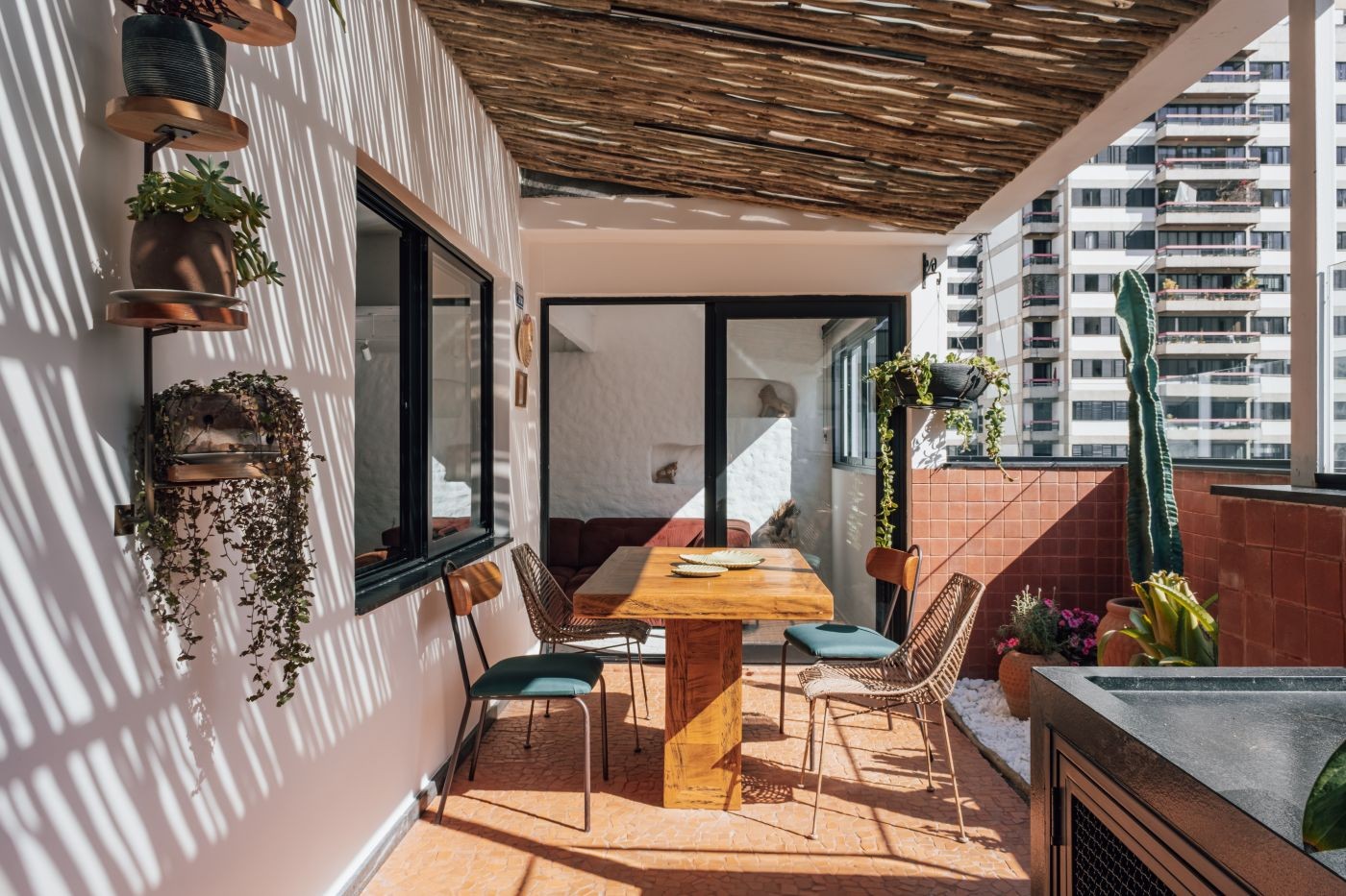 Ainda na varanda, a paleta em tons terrosos cria contraponto à paisagem urbana. O piso recebeu cacos de cerâmica alaranjada e a parede foi revestida de ladrilhos avermelhados. Acima, uma leve cobertura de vidro e alumínio, protegida por biribas de eucalipto, garante sombreamento e conforto climático sem comprometer a leveza do espaço.