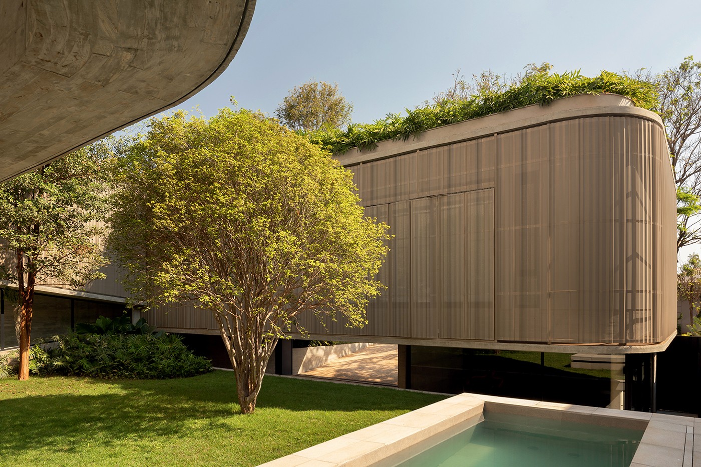 “A volumetria com curvas é uma ruptura das caixas que remete à figura feminina da minha mãe”, afirma Pedro. Já a segunda pele vem do conceito de fachada dupla que tem benefícios termoacústicos.