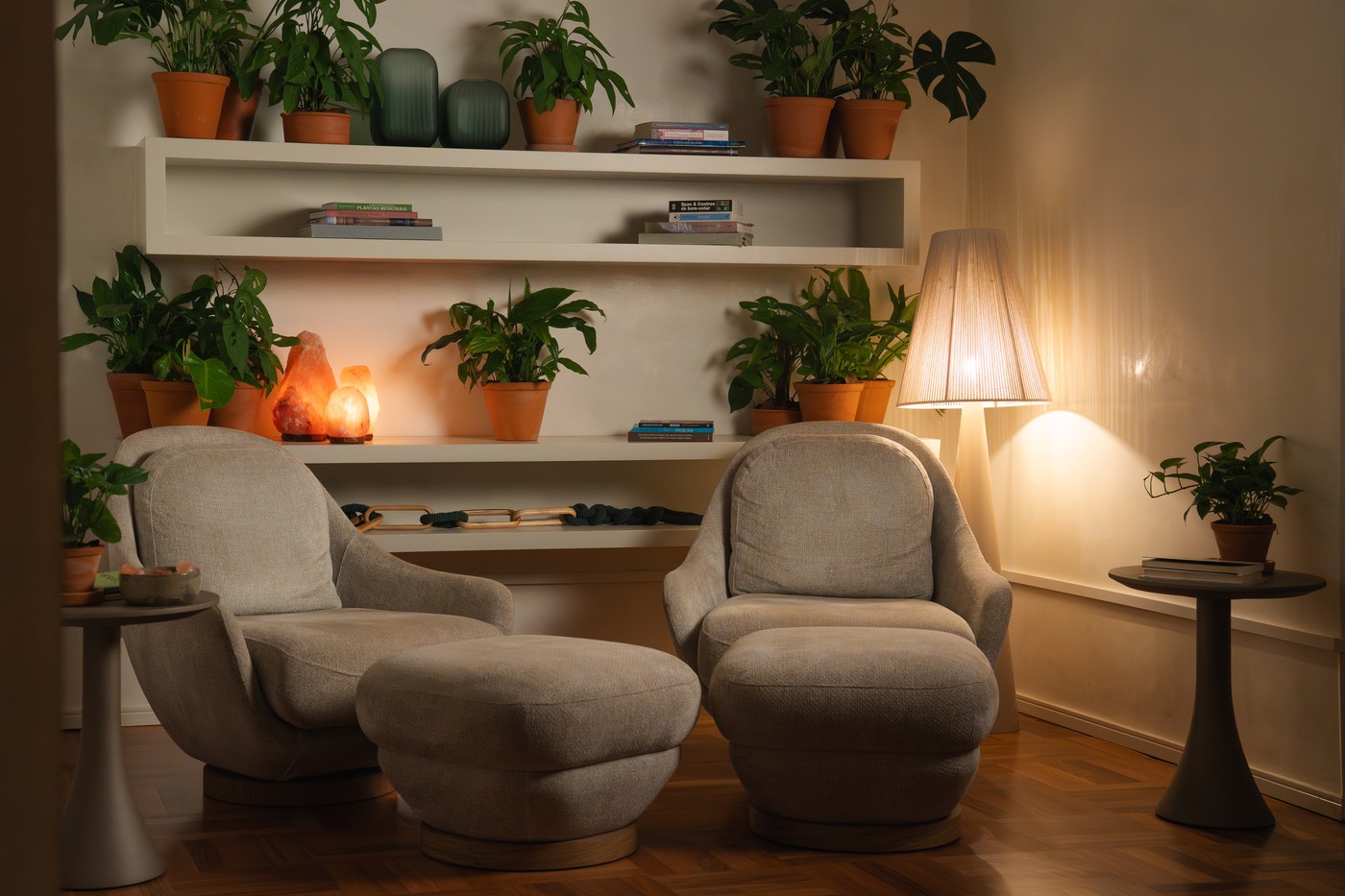O ambiente do spa foi projetado para acalmar os sentidos. A iluminação suave das luminárias de sal rosa do Himalaia cria uma atmosfera serena, enquanto as janelas amplas promovem conexão direta com o verde exuberante que envolve o hotel.