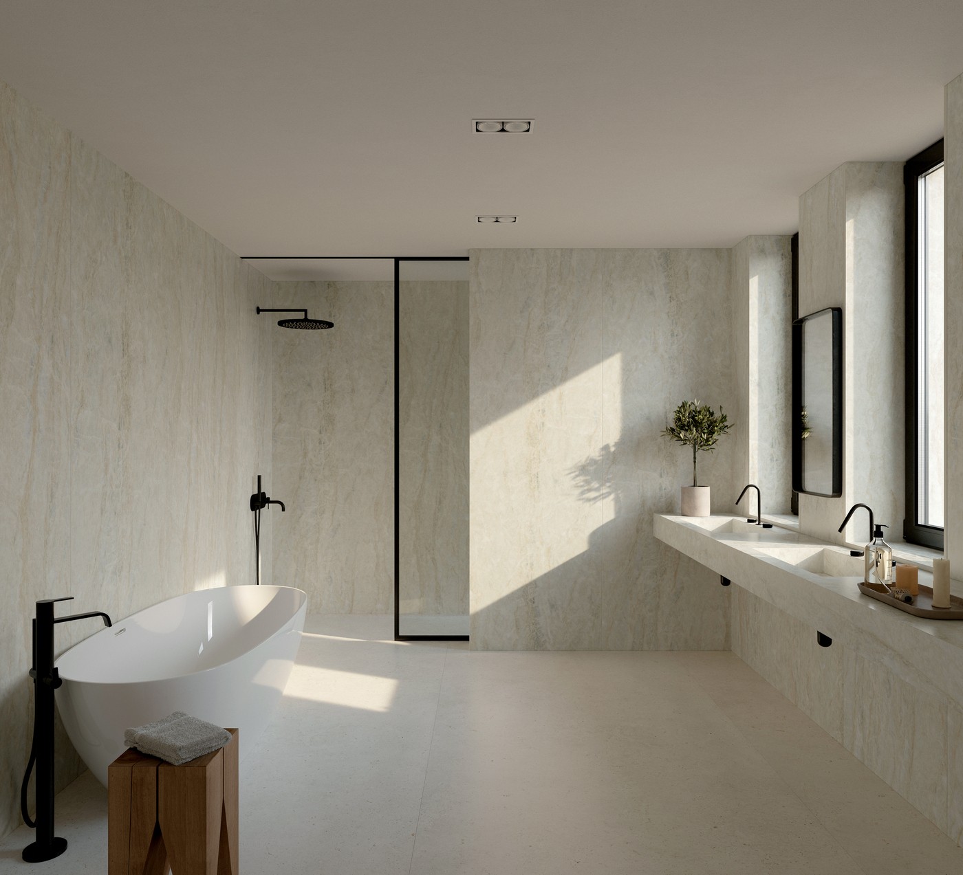 Enquanto pedras naturais podem apresentar variações no padrão, restrições de uso e manutenção intensa, a superfície ultracompacta Dekton entrega estabilidade estética; alta resistência a riscos, manchas e raios UV; baixa absorção de água; resistência ao choque térmico; chapas de grandes formatos e várias espessuras; e neutralidade de carbono em todo o portfólio.