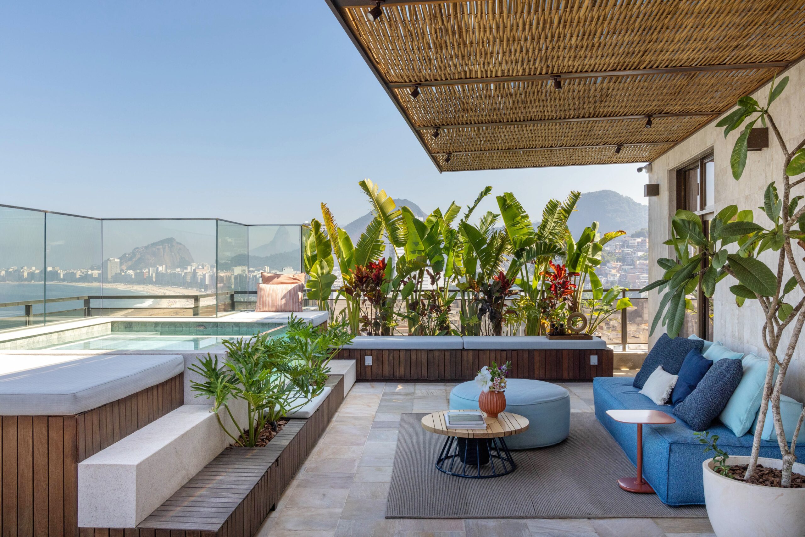 A distribuição do mobiliário e das jardineiras foram pensadas de forma a preservar a vista para a Praia do Leme. Destaque para figueira-benjamim e cróton com forração de dólar próximo à espreguiçadeira