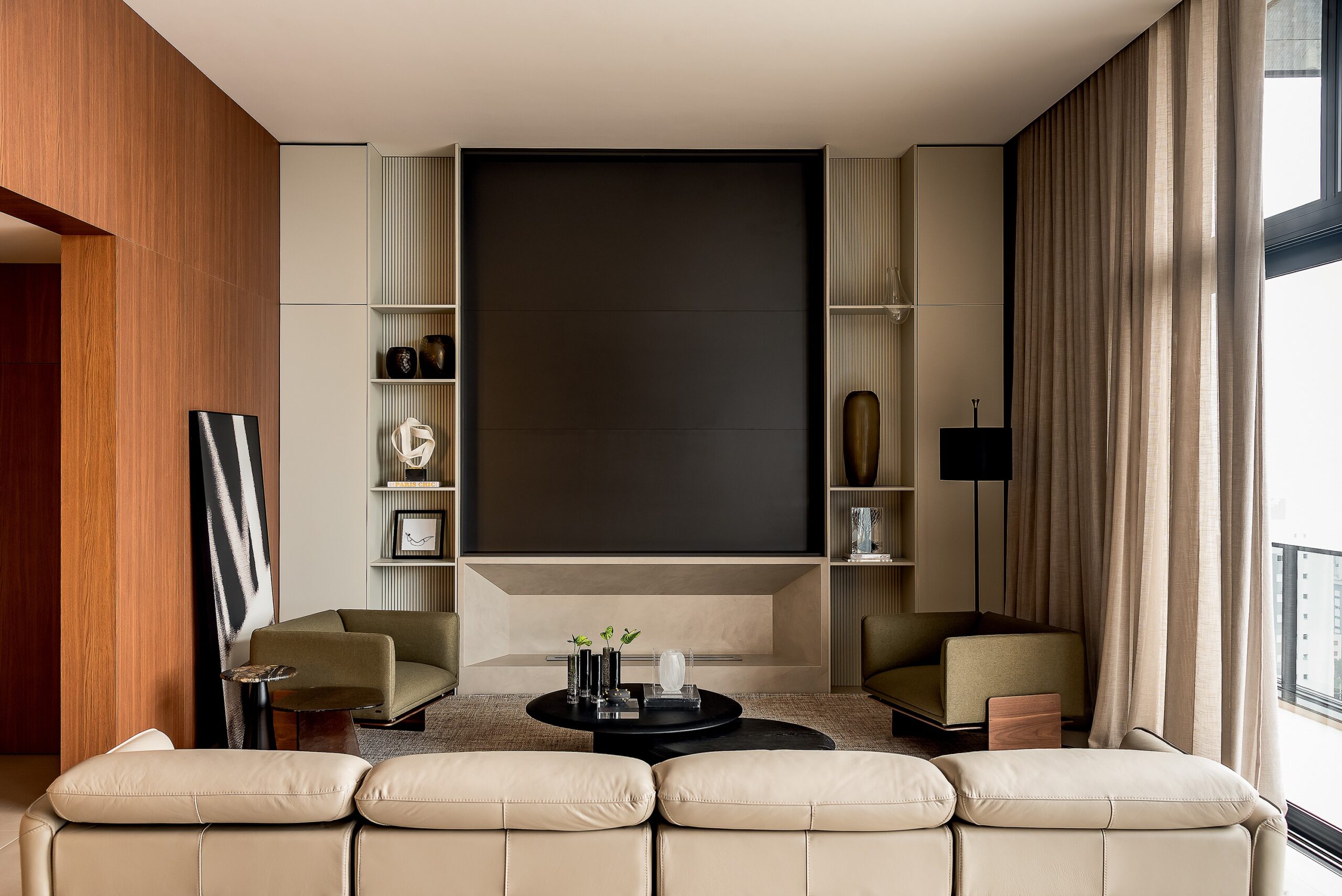 No living, destaca-se a poltrona Amburana, design Maurício Bomfim, acompanhada das mesas de centro Cisa, design Ronald Sasson, mesmo autor da luminária de piso Folk Alta – tudo na Benvenutti –, além das cortinas de linho italiano e persianas automatizadas da Hunter Douglas, na Ombra Decor